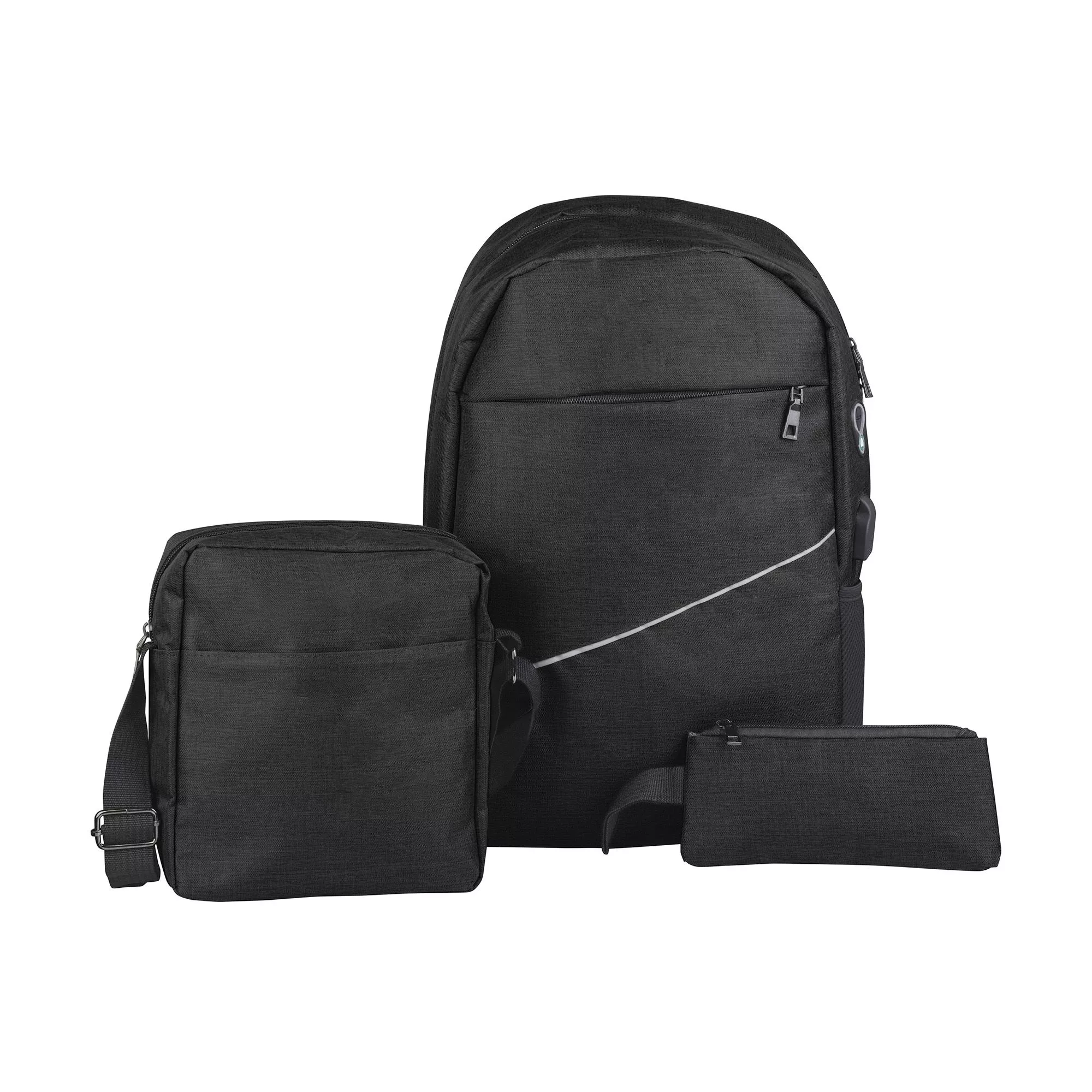 Аксессуары изготовлены из качественного материала - полиэстер c визуальноприятным рисунком. Предметы набора можно использовать самостоятельно. Рюкзак держит форму благодаря плотной вставке, внутри серый подклад. Есть разъем для подключения зарядки и выход для проводных наушников сверху. Замки на молнии из специального сплава без окраски для повседневной эксплуатации. Дополнительный карман на молнии спереди и карман-сетка сбоку для увеличения полезного объема.