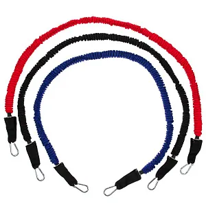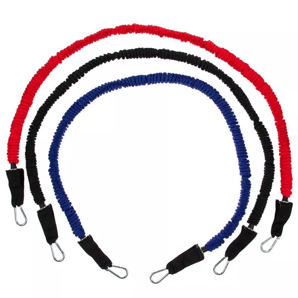 В набор входит 3 трубчатых эспандера с разной степенью нагрузки от 6,8 до 15,8 кг. Меняя и комбинируя их, можно усиливать или ослаблять нагрузку во время тренировки.