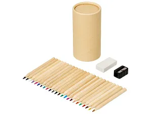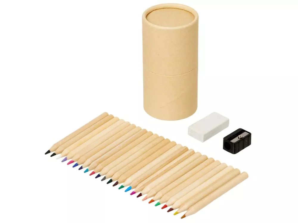 Набор из 24 цветных карандашей, ластика и точилки в круглом картонном футляре, который удобно использовать как карандашницу. Тампопечать (1 цвет (цветные изделия)) на данный товар осуществляется бесплатно. Оплачивается только настройка оборудования в размере 8200 рублей на весь тираж.