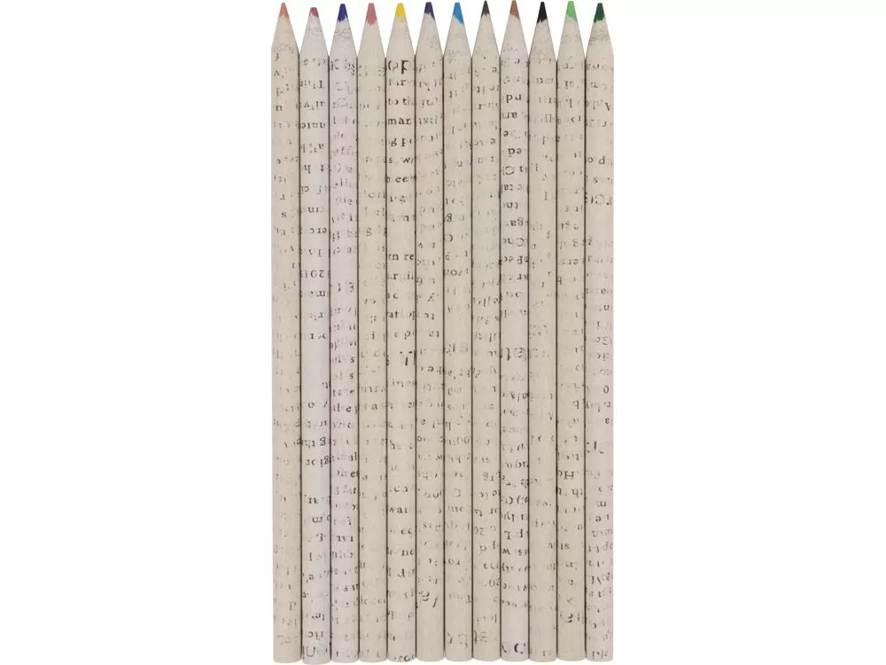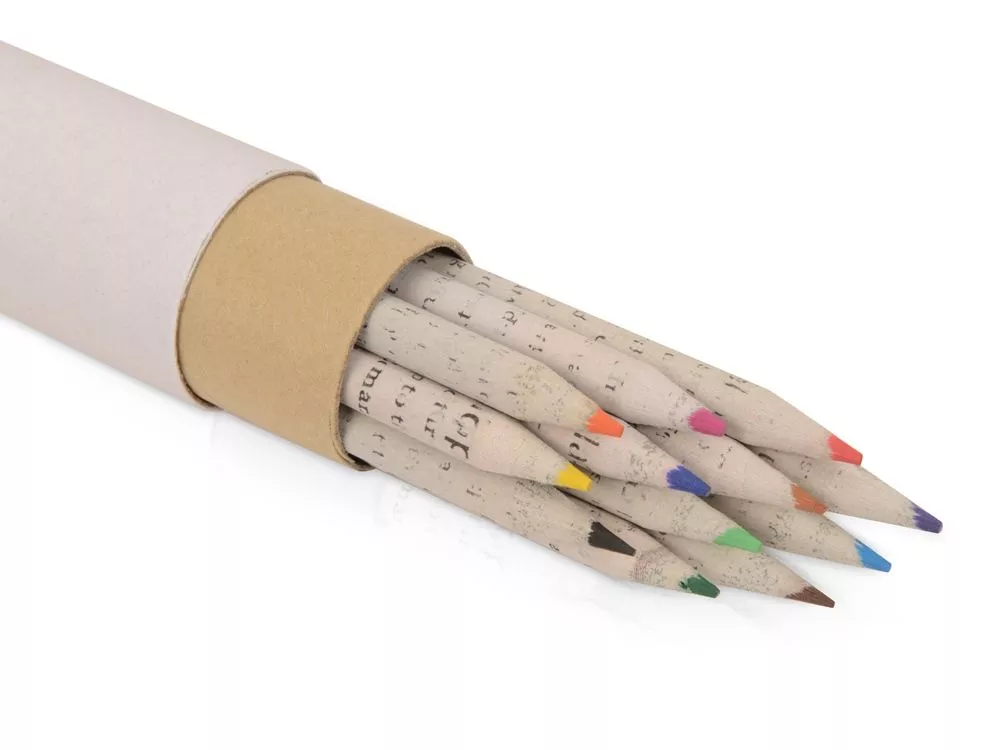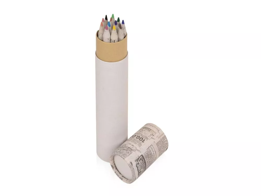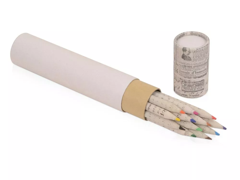 Набор цветных карандашей, выполненных в оригинальном корпусе из имитации газетной бумаги. Благодаря пеналу в форме тубуса удобно хранить или брать с собой. Набор состоит из карандашей 12 цветов. Тампопечать (1 цвет (цветные изделия)) на данный товар осуществляется бесплатно. Оплачивается только настройка оборудования в размере 2300 рублей на весь тираж.