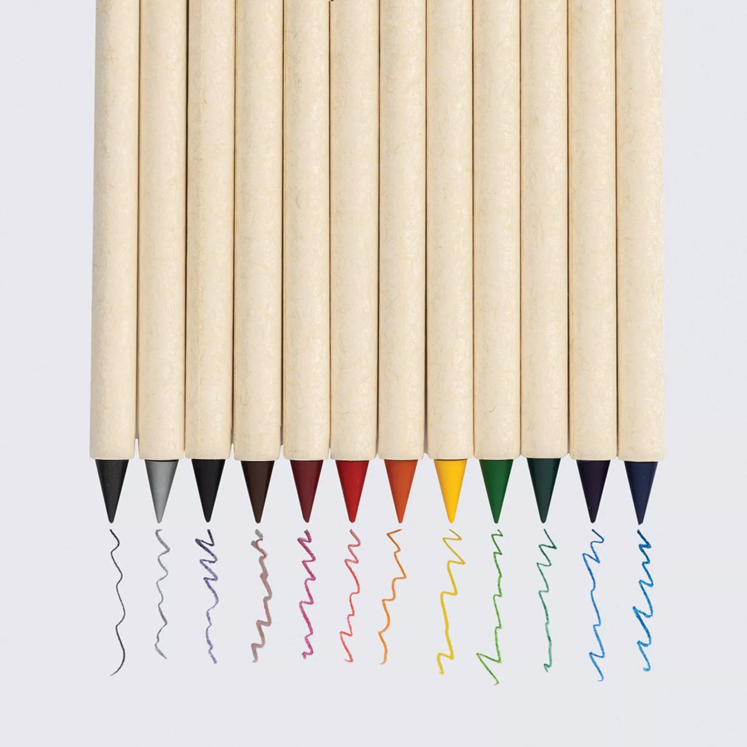 Каждый карандаш на 94% состоит из переработанной бумаги от молочных пакетов (сертификат GRS) и оснащен прочным графитовым стержнем для плавного и долговечного письма. В отличие от традиционных деревянных карандашей, которые пишут около 200 метров, вечные карандаши могут прочертить линию до 20 000 метров.