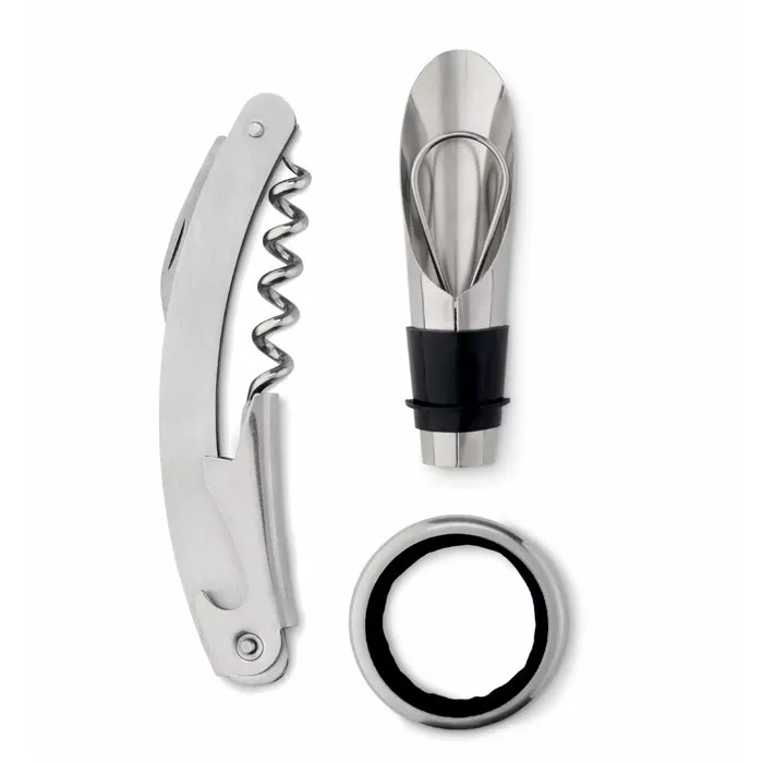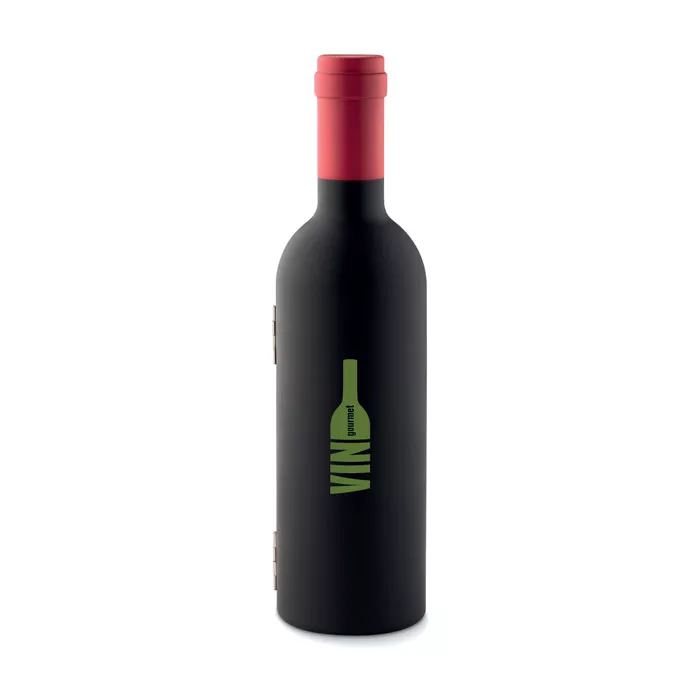 Винный набор в форме бутылки, включающий пробку, штопор и воротник для бутылки. Закрывается на магнит.