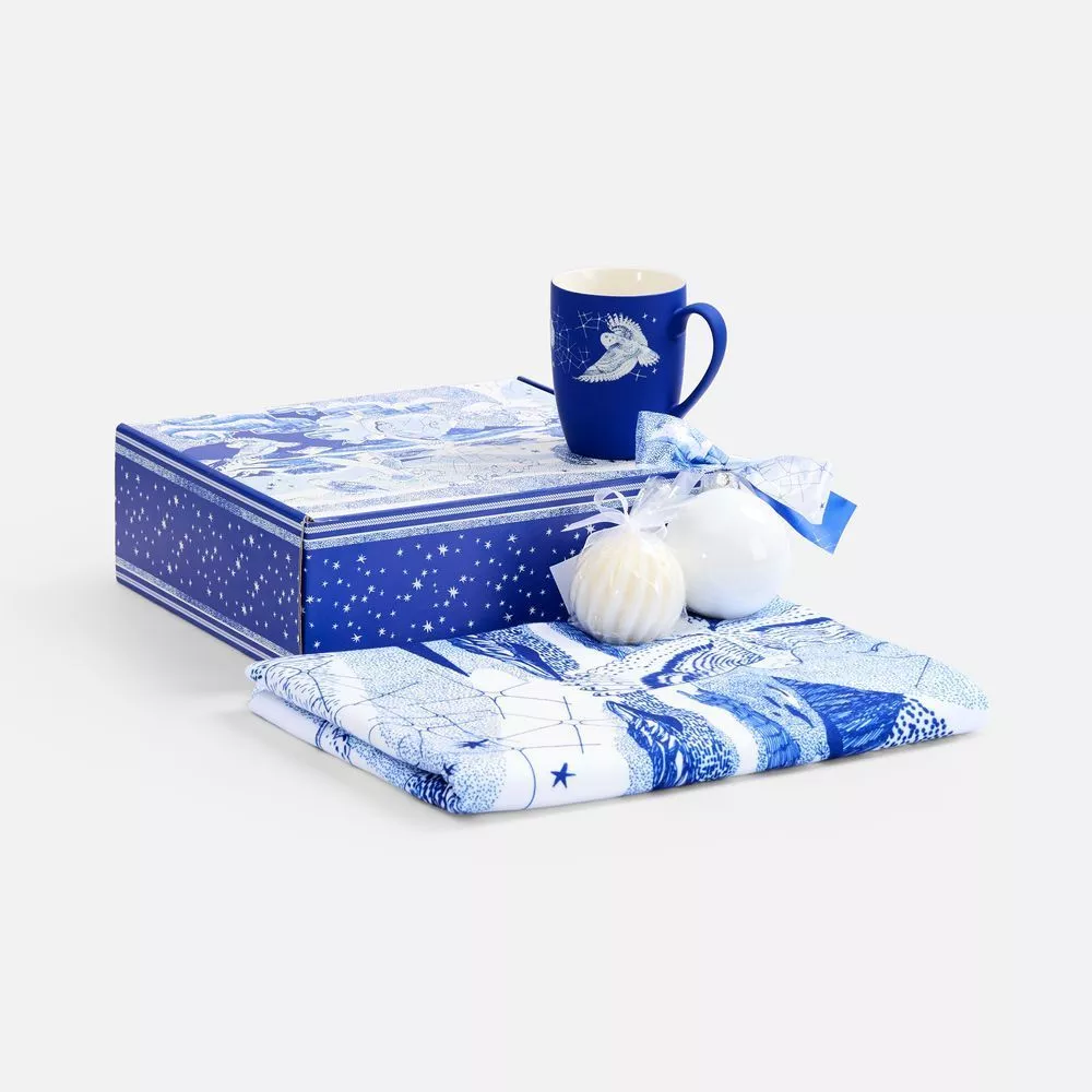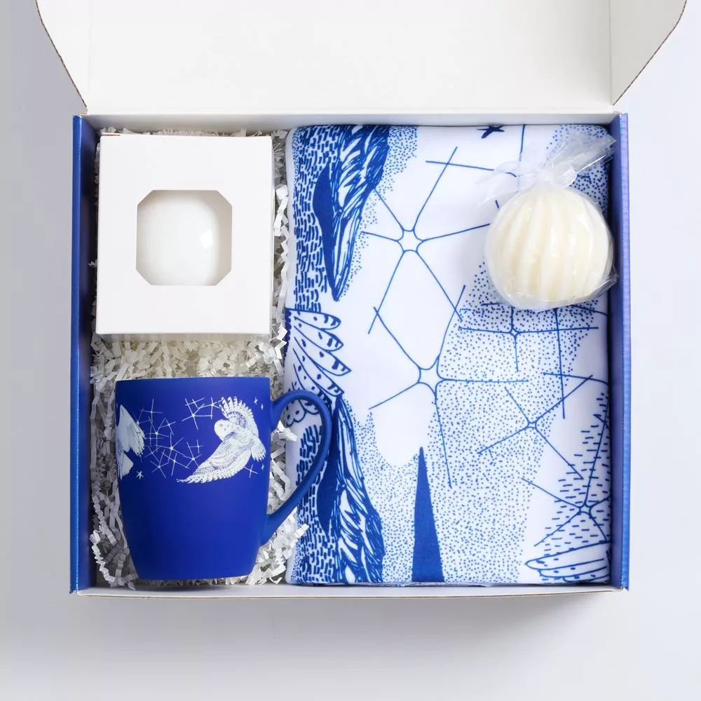 Изящная гравировка с парящими совами на кружке дополняет композицию, а лента елочного шара украшена небесным орнаментом — созвездиями и всполохами сияния. Так магии Севера становится еще больше, а весь набор вызывает приятный трепет. Тонкие линии, будто выведенные вручную, придают ему графичную изысканность.