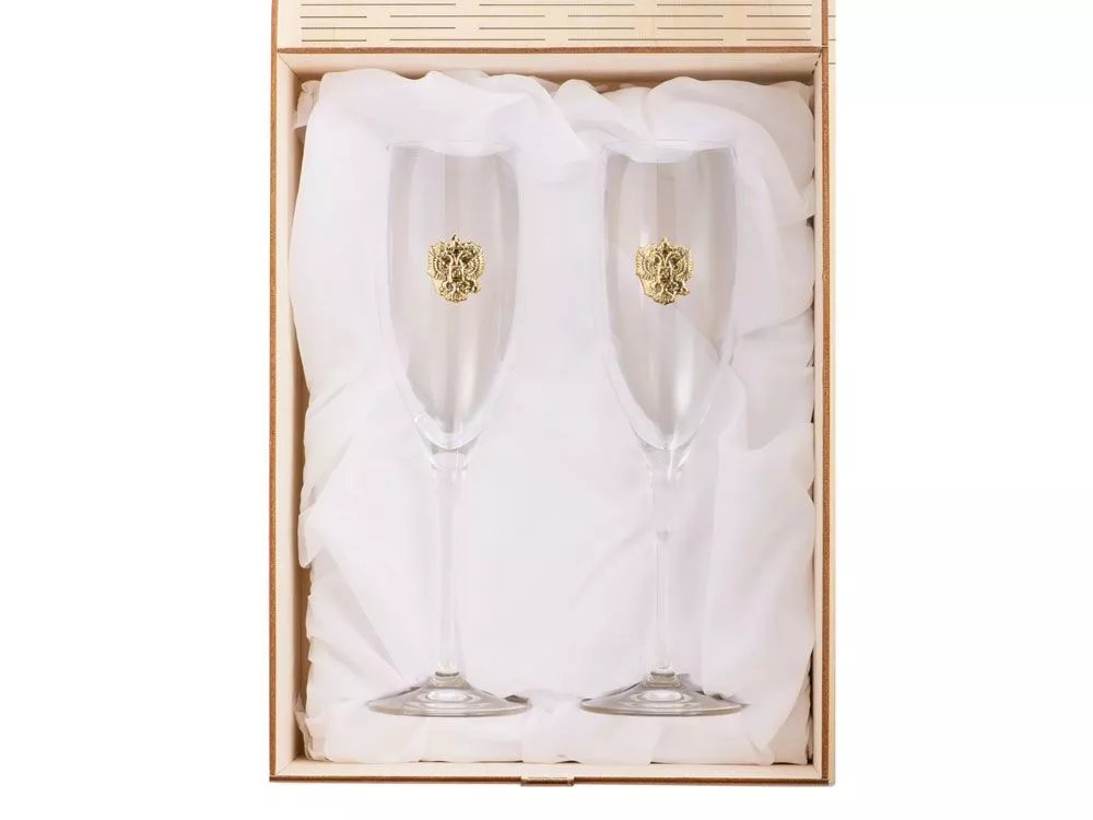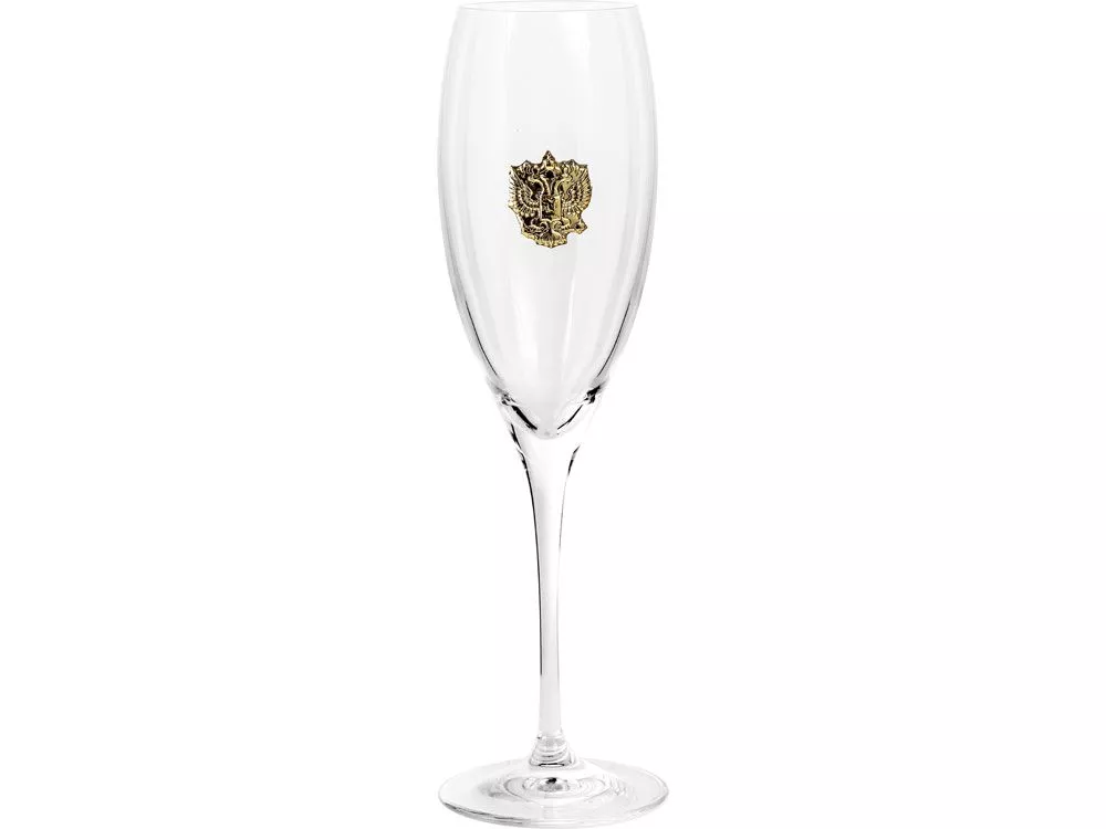 Набор бокалов для шампанского. Благородное флорентийское стекло прекрасно смотрится с российским гербом. Именно так итальянцы решили выразить свою любовь к России. Гравировка (CO2 лазер) (Без чернения) на данный товар осуществляется бесплатно. Оплачивается только настройка оборудования в размере 950 рублей на весь тираж.
