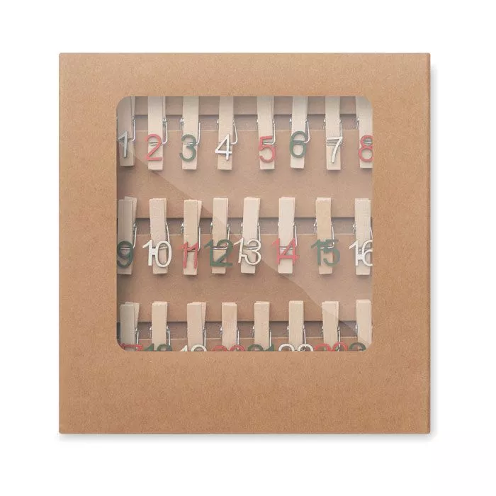 Набор из 24 деревянных зажимов для адвент-календаря. Поставляется в коробке из крафт-бумаги с окошком на лицевой стороне.