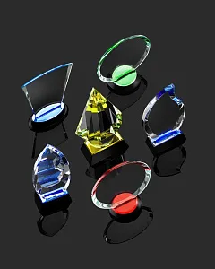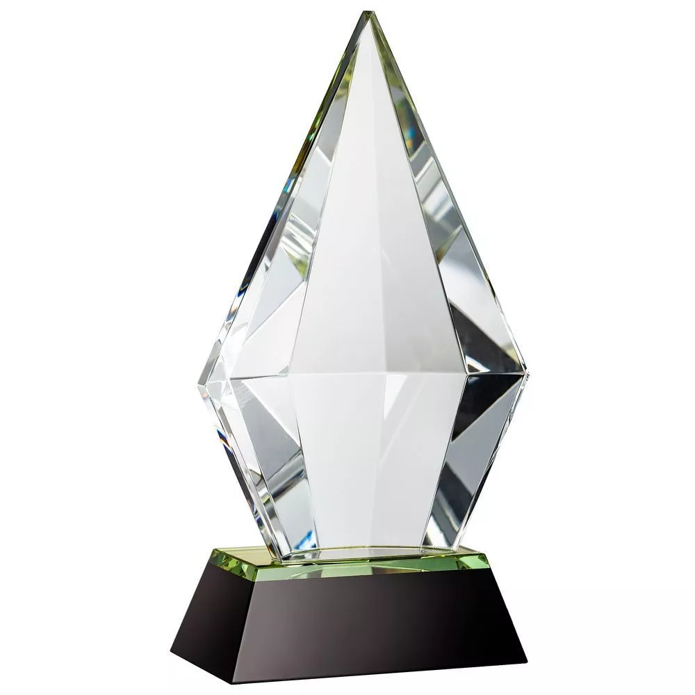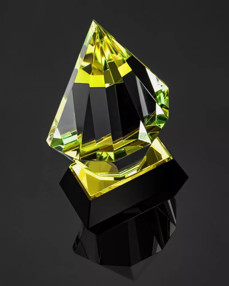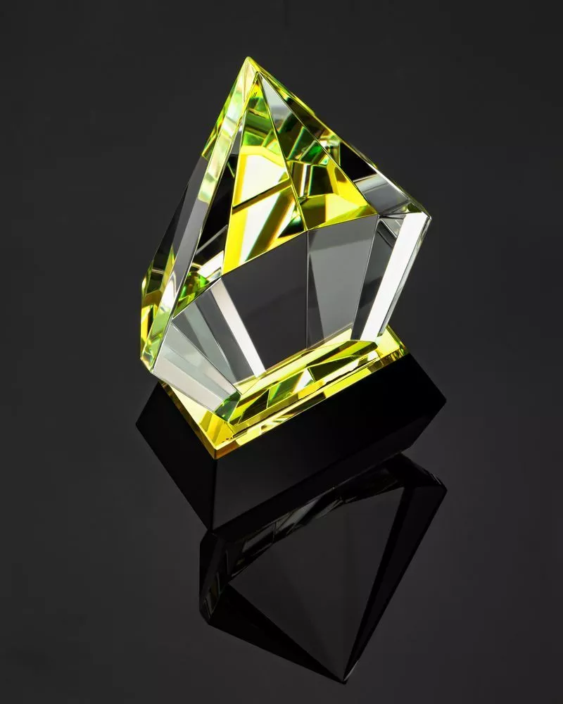 Стела изготовлена из хрусталя К9, в основе которого лежит оптическое боросиликатное стекло. Эту марку хрусталя отличает низкий процент посторонних включений, высокий показатель преломления и высокая прозрачность — идеальные качества для изготовления наград премиального уровня.