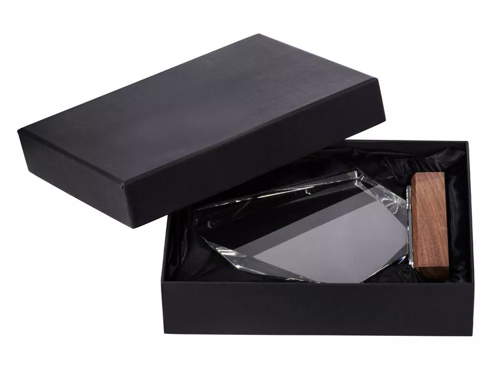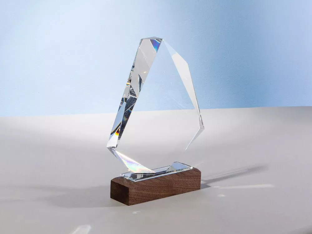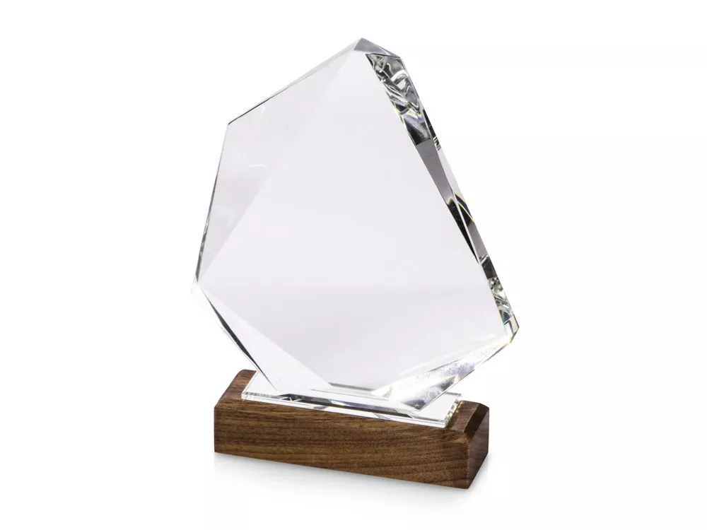 Награда выполнена из прозрачного стекла, имеет интересную асимметричную форму и расположена на деревянном постаменте. Вставка из синего стекла между основной частью и основанием позволяет награде бликовать синим цветом в зависимости от угла падения света. • Интересная форма • Синяя стеклянная вставка между основной частью и основанием • Деревянная подставка Гравировка (CO2 лазер) (Без чернения) на данный товар осуществляется бесплатно. Оплачивается только настройка оборудования в размере 1000 рублей на весь тираж.