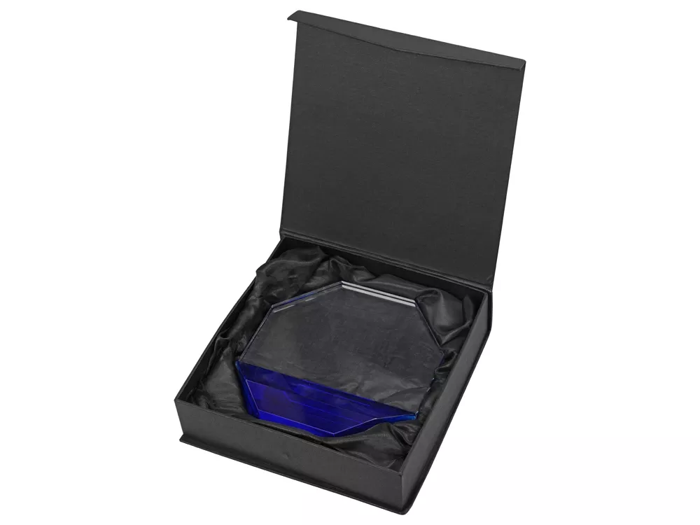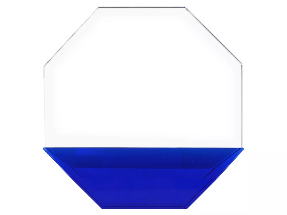 Награда в форме восьмигранника, который является древним символом наивысших достижений человека и духовного подъема, прекрасно выразит признательность и уважение, заложенное в такой бизнес-подарок. Нанесение доступно по всей площади награды, благодаря сочетанию прозрачного и синего стекла можно зонировать нанесение и экспериментировать с типами начертаний.