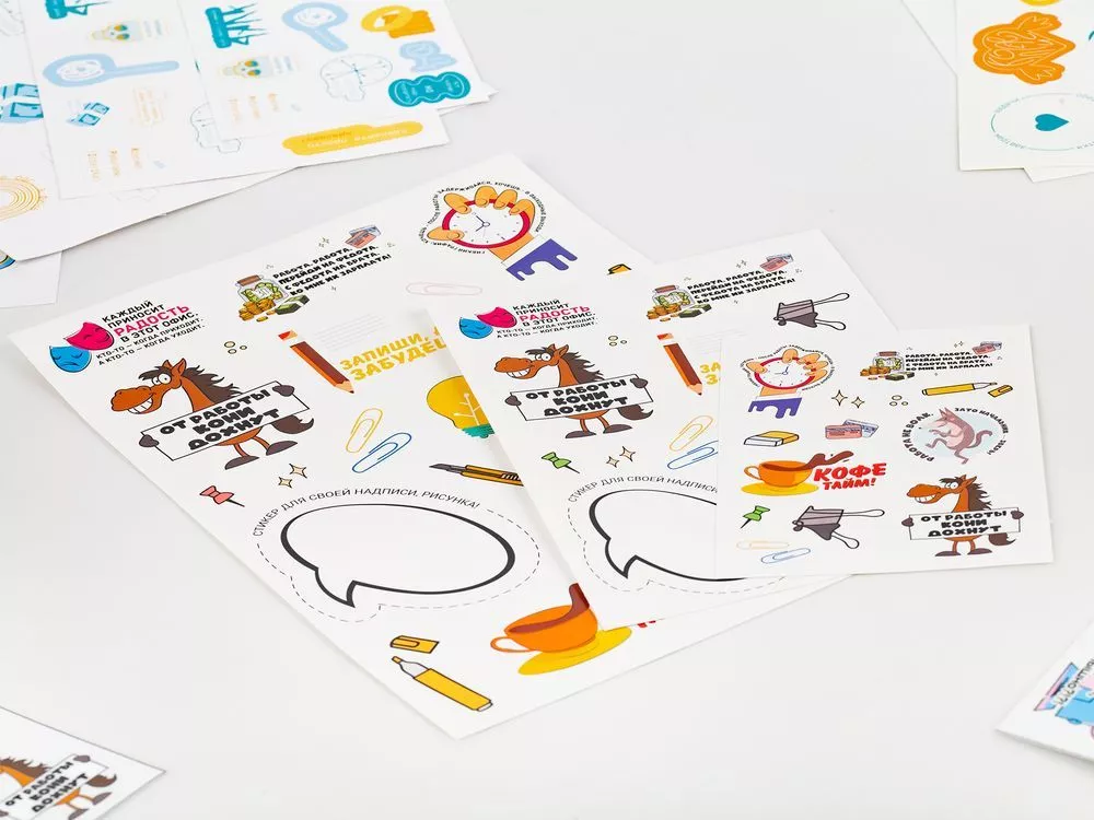 Бумажные наклейки Sticker Pack — отличный способ легко и быстро украсить рабочее место, электронику, дом или подарки. Они также являются прекрасной рекламой для повышения узнаваемости компаний, ведь она начинается с мелочей. Яркие наклейки не оставят клиентов равнодушными и отлично поднимут настроение.