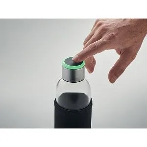 Стальная бутылка из боросиликатного стекла с напоминанием о гидратации в чехле. Сенсорный индикатор светится каждый час, напоминая о том, что пора пить. Включает 1 батарейку CR2032. Емкость: 500 мл.