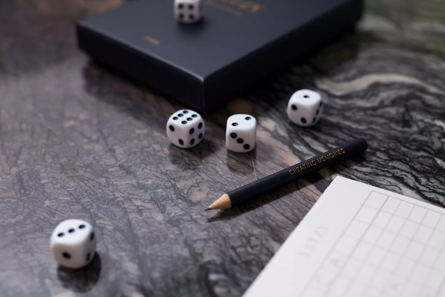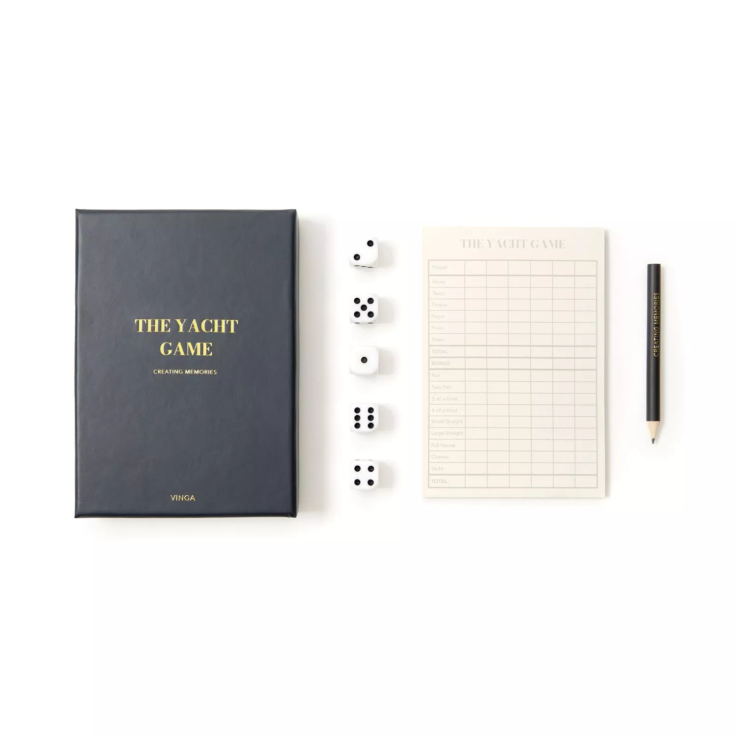 Игра в кости с пятью кубиками в стильной коробке с золотыми буквами. Благодаря красивому оформлению игра Яхта станет особенным подарком и прекрасным дополнением к интерьеру.