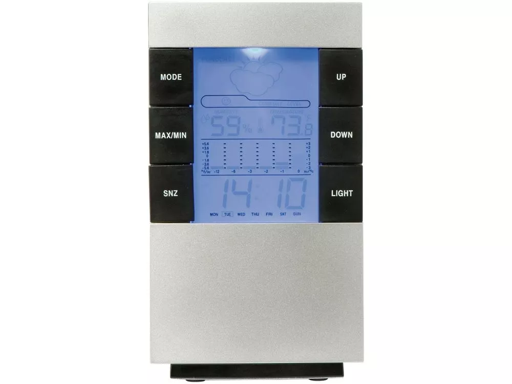 Настольная метеостанция Como. Настольная метеостанция с будильником с повторением сигнала, с указанием даты и дня недели, подсветкой, термометром в градусах по Цельсию и Фаренгейту и гигрометром. Требуются 2 батарейки размера AAA (не включены в комплект). Пластик.