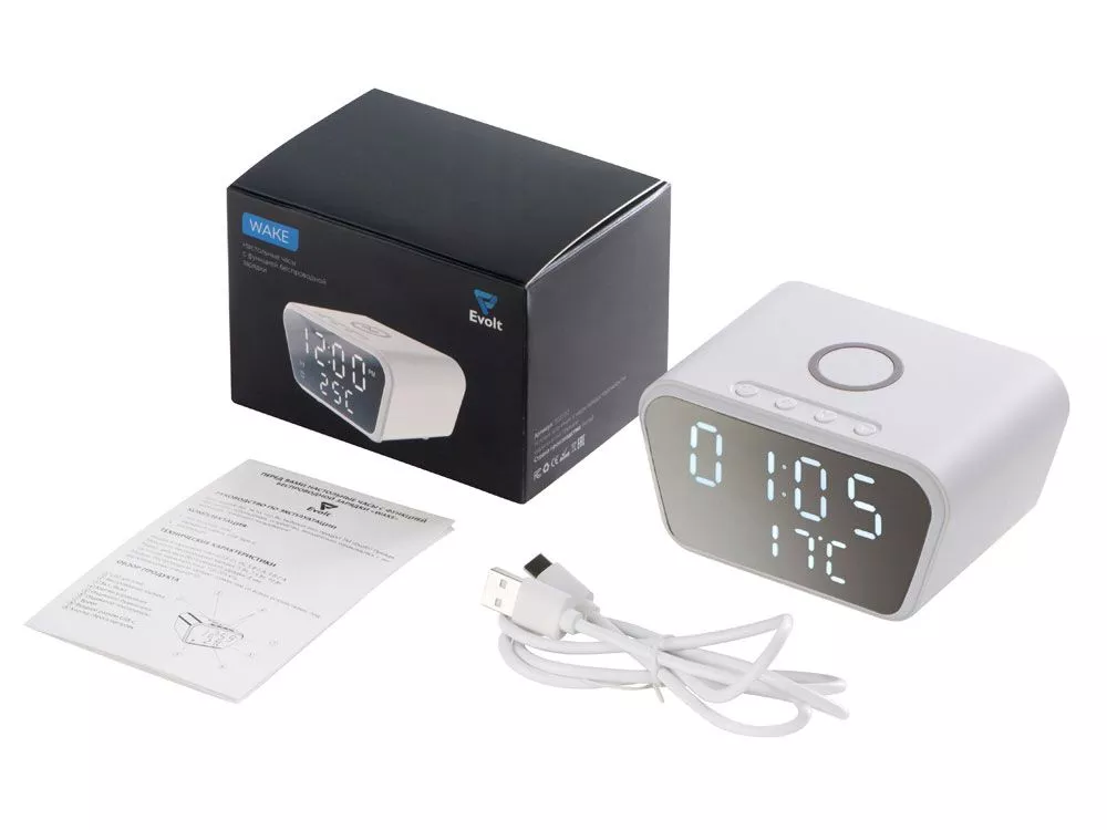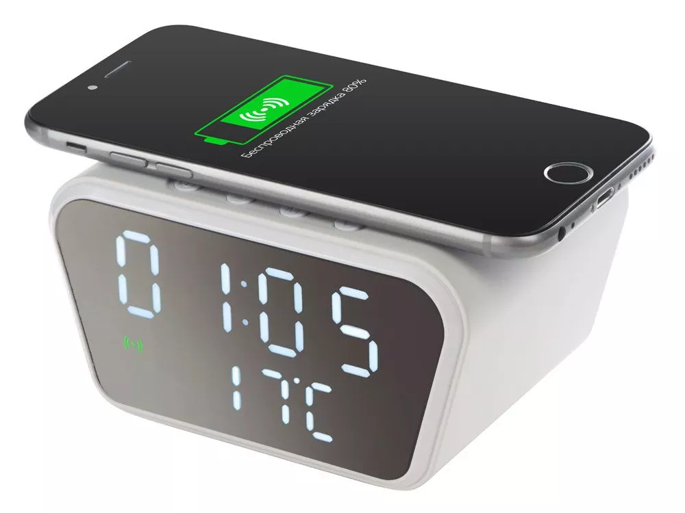 Настольные часы с функцией беспроводной зарядки позволят не только вовремя проснуться, но и восполнить за ночь уровень батареи вашего смартфона. Зеркальный LED-дисплей часов интересно выглядит в интерьере, а степень яркости можно изменить под себя. - будильник - отображает температуру в помещении - несколько режимов отображения данных - лаконичный дизайн часов уместно будет выглядеть в любом интерьере - регулировка степени яркости экрана Тампопечать (1 цвет (белые изделия)) на данный товар осуществляется бесплатно. Оплачивается только настройка оборудования в размере 7300 рублей на весь тираж.