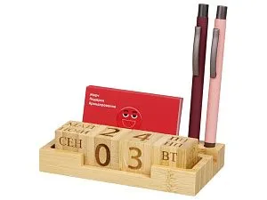 Настольный органайзер с вечным календарем и подставкой для мобильного телефона станет очень удобным помощником для организации пространства на рабочем столе. Кубиками можно выставить нужную вам дату и день недели. Также у органайзера есть подставка для визиток, телефона и 2-х ручек. Гравировка (CO2 лазер) (Без чернения) на данный товар осуществляется бесплатно. Оплачивается только настройка оборудования в размере 1100 рублей на весь тираж.