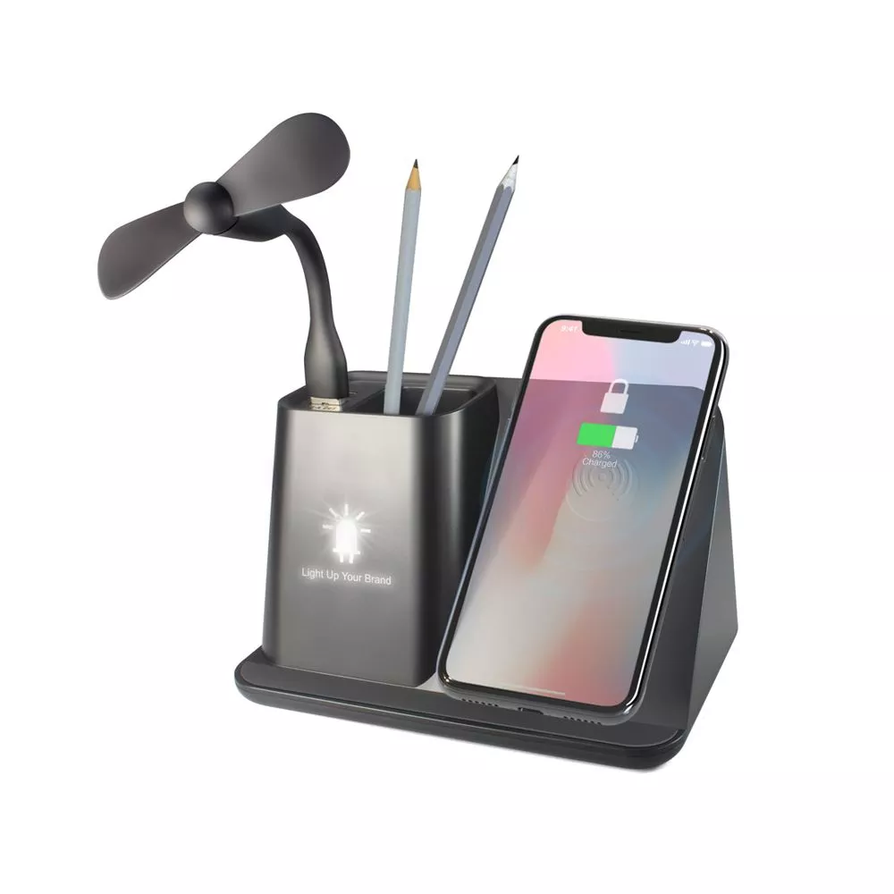 Органайзер Mercury – выгодный и эффективный способ продвижения. Со 100% гарантией, такой подарок найдет себе место на рабочем столе или в домашней обстановке. В душные дни, портавиный вентилятор добавит свежести, а со встроенной беспроводной зарядкой вы всегда будете на связи. Логотип вашего бренда будет эффектно напоминать о себе каждый день, благодаря подсветке, которая видна после гравировки. Беспроводная зарядка 5W. USB и USB Type С выходы (вход: 5V/2A, выход: 5V/2A 5W). Комлектация: капель Type-C, инструкция.