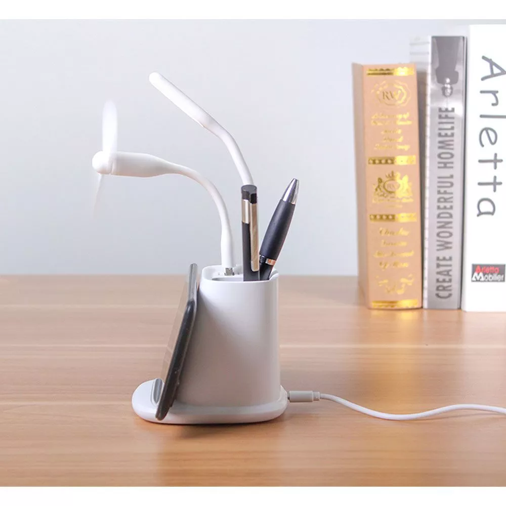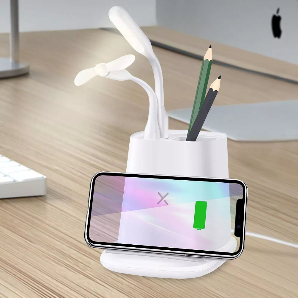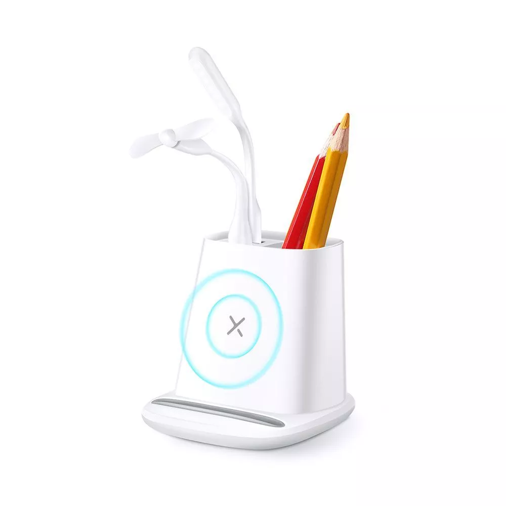 Комплекталия: кабель USB Type-C, инструкция на русском языке, вентилятор, LED светильник. Электропитание, вход: 5V/2A. Выход: Беспроводная зарядка - 5W, 2хUSB - 5V/2A.