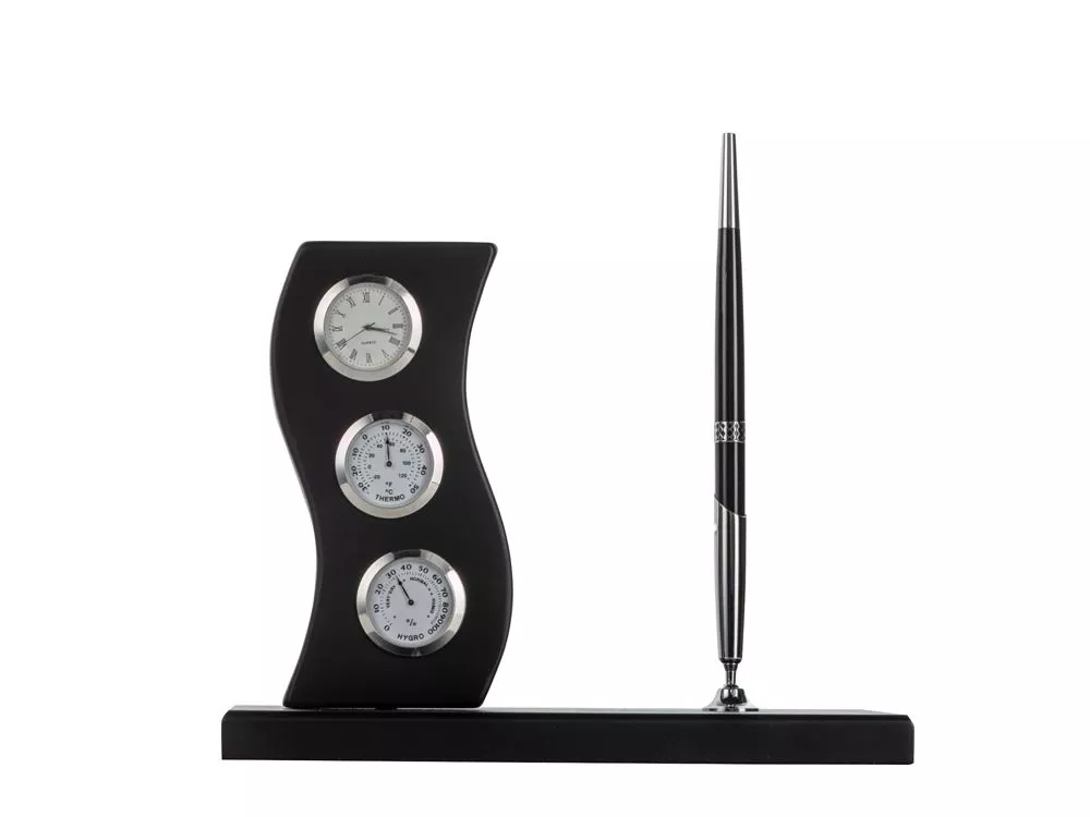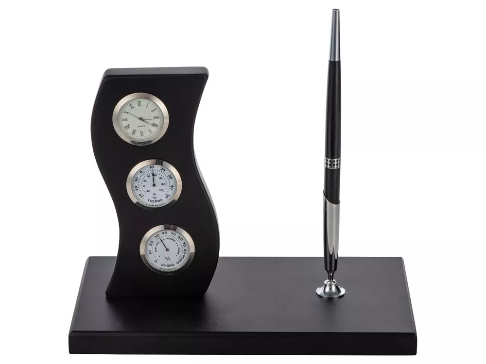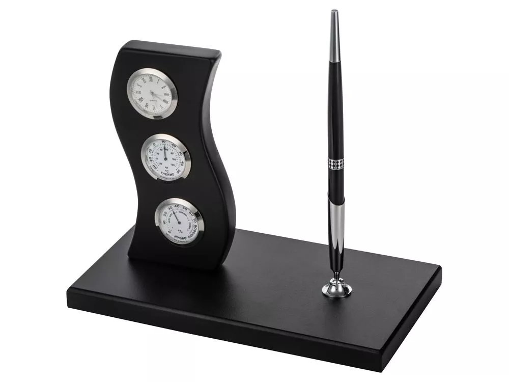Замечательный прибор станет центральной фигурой рабочего стола руководителя. Настольный прибор оснащен держателем для ручки, шариковой ручкой, часами и небольшой метеостанцией. Удачное сочетание цветов и фактур не оставит равнодушным даже самых притязательных. Тиснение (Блинт) на данный товар осуществляется бесплатно. Оплачивается только настройка оборудования в размере 5800 рублей на весь тираж.