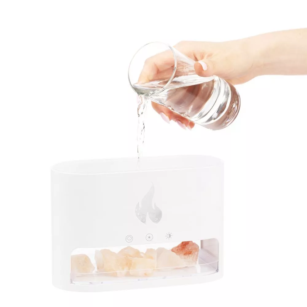 Благодаря оптическому эффекту пламя как будто вырывается из устройства, напоминающего настольный камин, а соль становится похожа на угли от прогоревших дров.