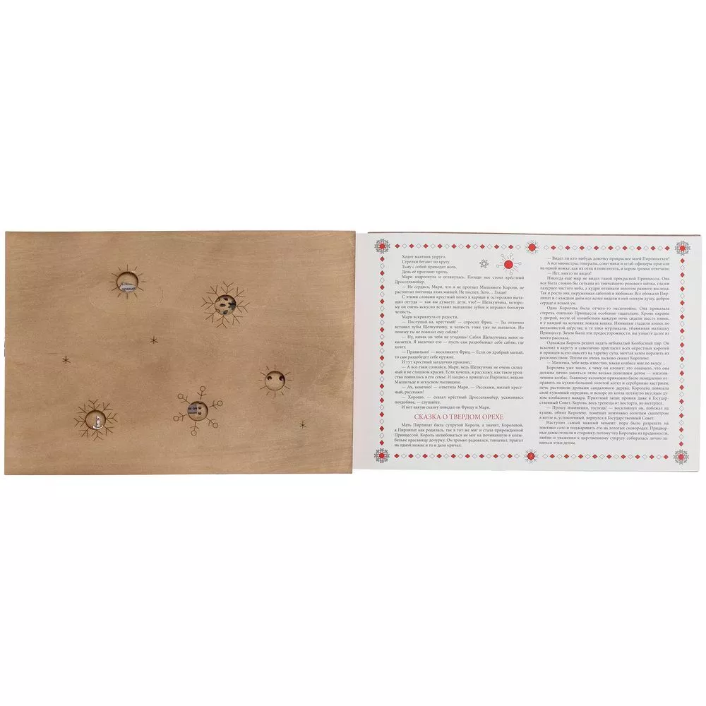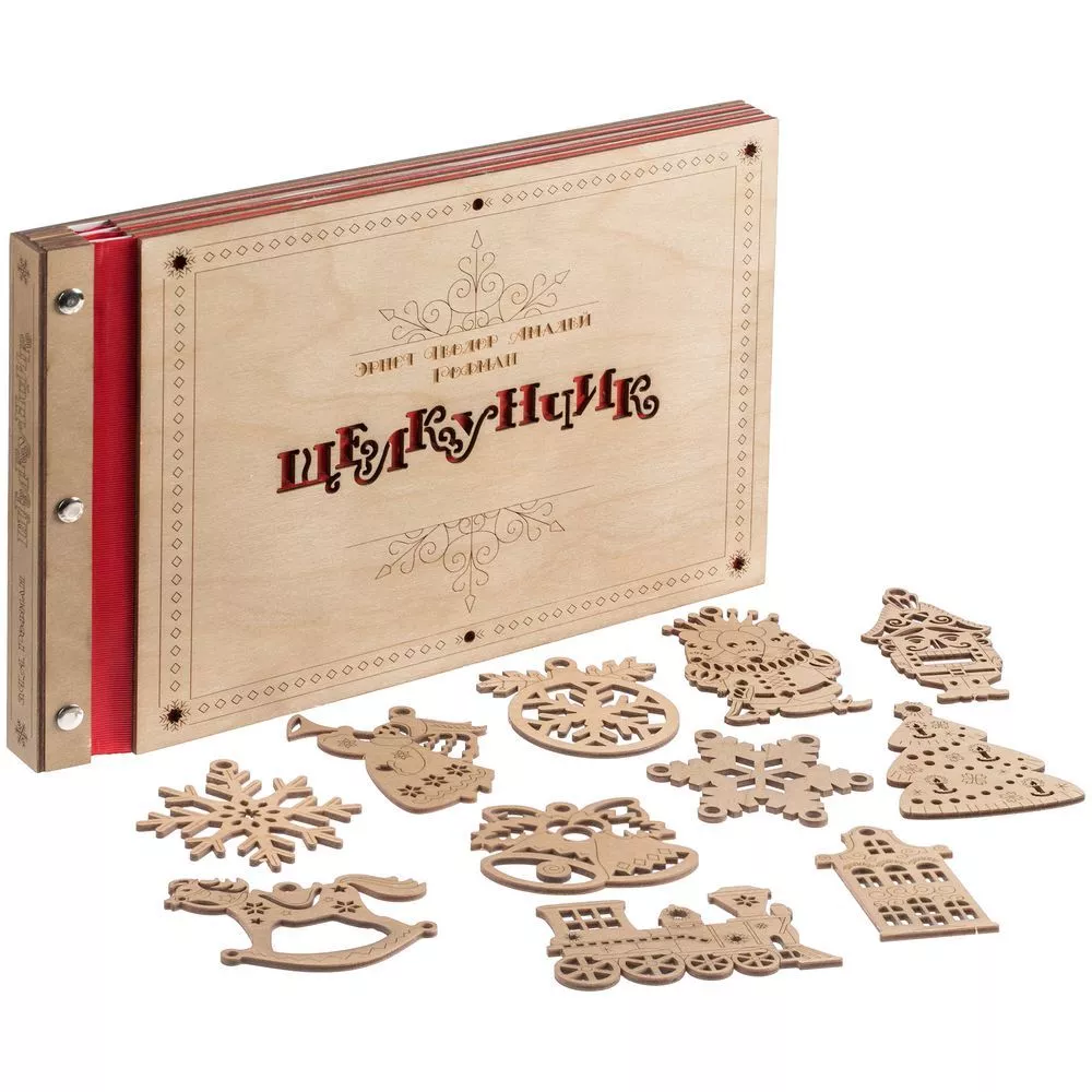 Новогодняя книга «Щелкунчик» способна вызвать тот неповторимый трепет от встречи с чем-то волшебным. Это сразу два чудесных подарка в одном необычном исполнении: резную книгу можно не только читать, любуясь каждой страницей, но и преобразовывать в настоящие деревянные елочные игрушки. Так история оживает прямо на глазах — как в лучших сказках и самой богатой фантазии, а сам презент впечатлит оригинальной задумкой и исполнением.В наборе книга Э.Т.А. Гофмана«Щелкунчик» в сокращении и 11 деревянных подвесок на елку.