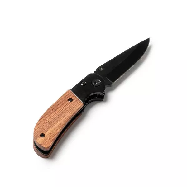 Нож из нержавеющей стали с черным лезвием и рукояткой из натуральной древесины. Идеальный нож для похода. Нож оснащен системой безопасности.