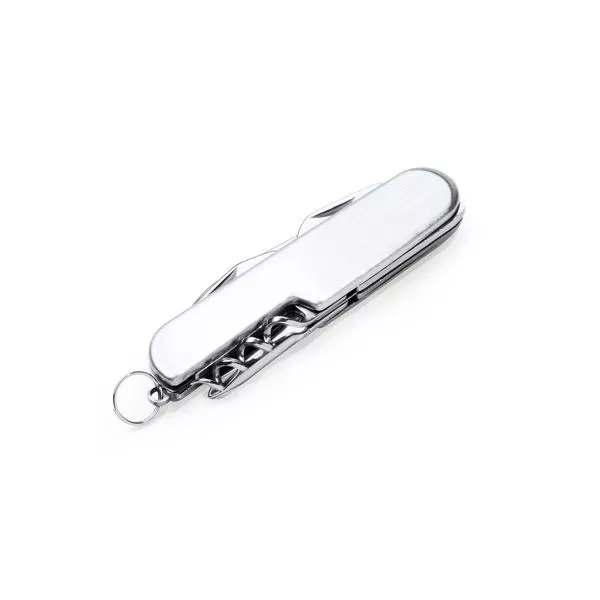 Многофункциональный нож из нержавеющей стали с 6 функциями: нож, открывалка для бутылок, консервный нож, штопор, отвертка и кольцо для ключей.