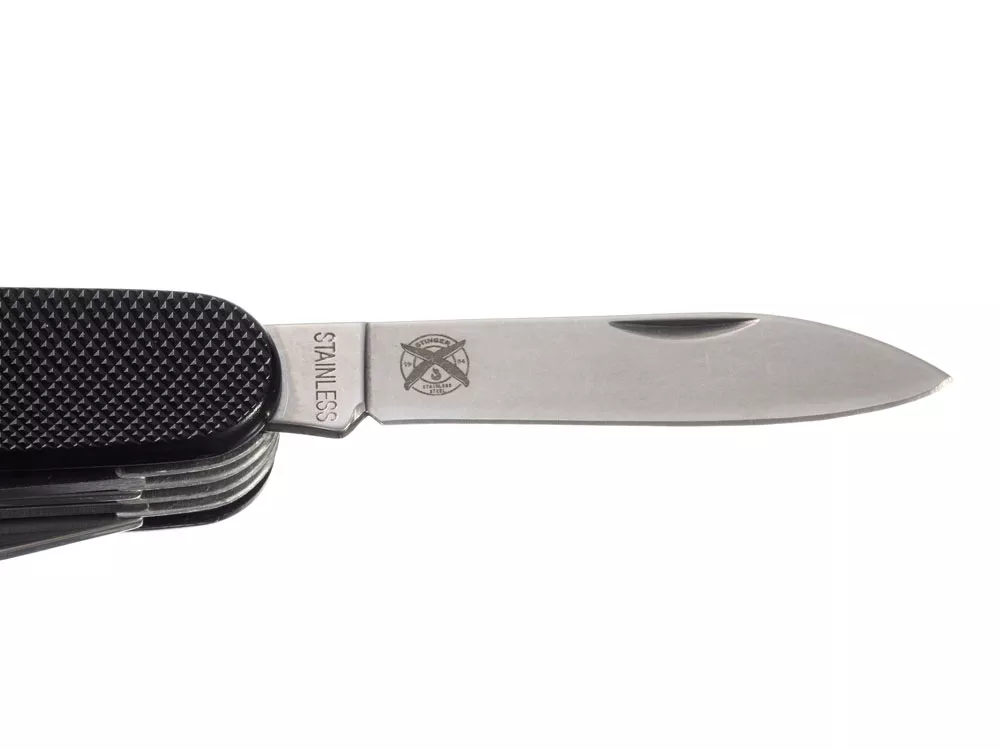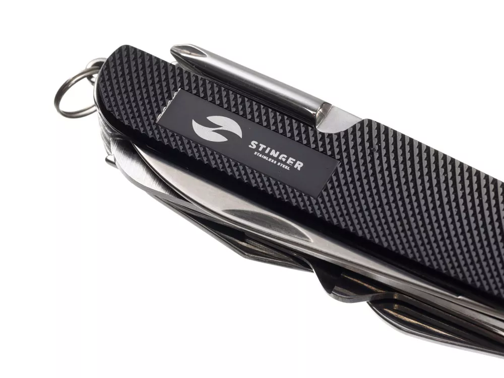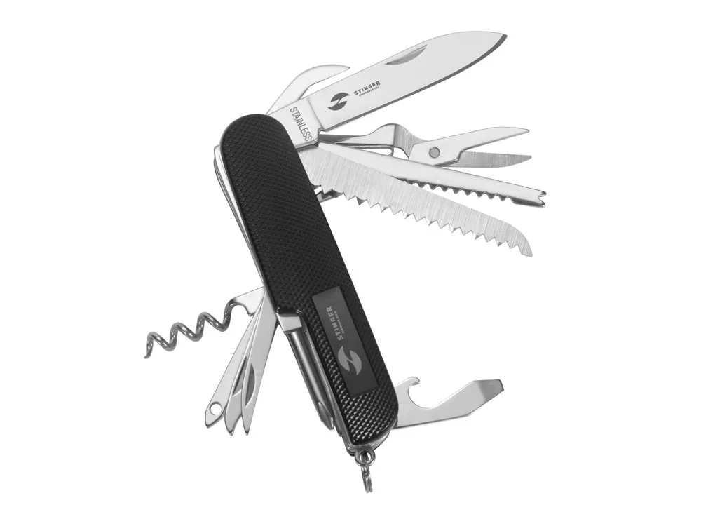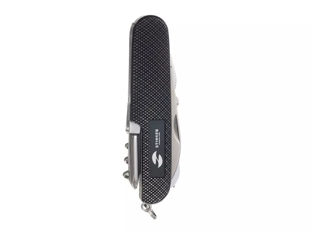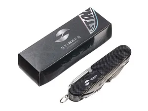 Нож перочинный STINGER имеет 15 функций: 1. Большое лезвие 2. Пила по дереву 3. Инструмент для чистки рыбы с: 4. - Инструментом для извлечения рыболовного крючка 5. Ножницы 6. Консервный нож 7. Открывалка для бутылок с: 8. - Отверткой 9. Крестовая отвертка 10. Ледокол 11. Пилка для ногтей с: 12. - Инструментом по уходу за ногтями 13. Игла 14. Штопор 15. Кольцо для ключей ХАРАКТЕРИСТИКИ Материалы: • лезвие/инструменты: нержавеющая сталь AISI 420, твердость 44-48 HRC • рукоять: нержавеющая сталь AISI 420, твердость 44-48 HRC • накладки рукояти: алюминий Размер: 89 мм Вес: 110 г Цвет накладок рукояти: черный Накладки рукояти ножа не подлежат замене. Упаковка: картонная коробка