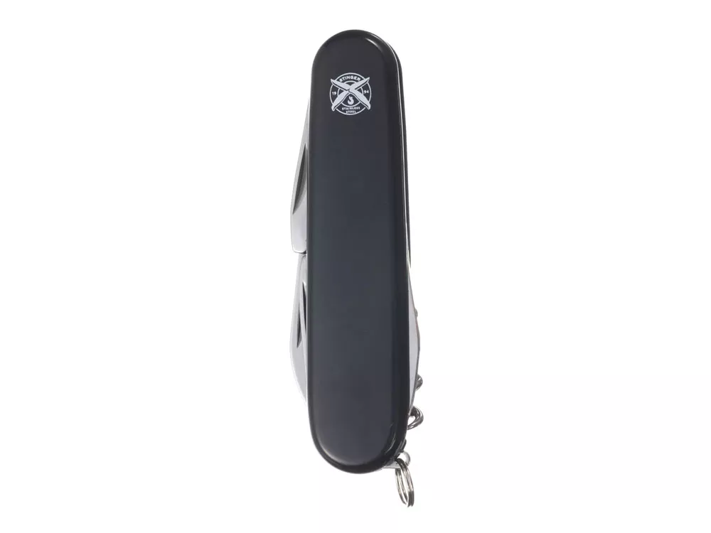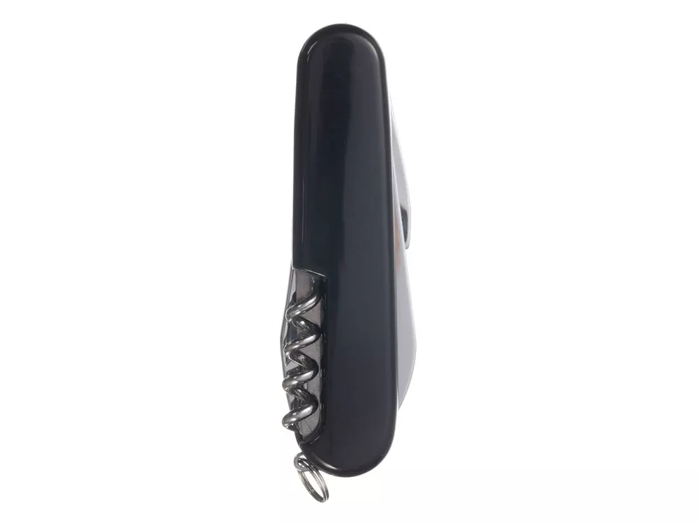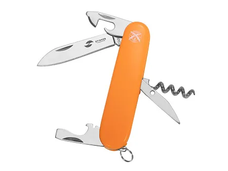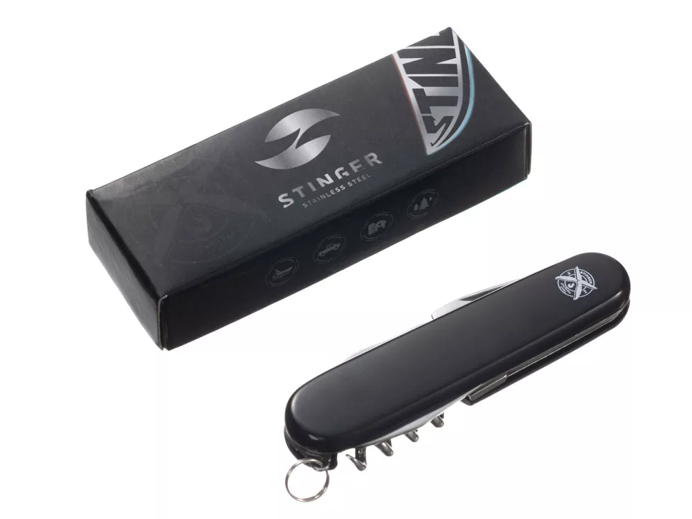 Нож перочинный STINGER имеет 10 функций: 1. Большое лезвие 2. Консервный нож с: 3. – Малой отвёрткой 4. Шило с: 5. – Иглой 6. Штопор 7. Открывалка для бутылок с: 8. – Отвёрткой 9. – Инструментом для снятия изоляции 10. Кольцо для ключей ХАРАКТЕРИСТИКИ Материалы: • лезвие/инструменты: нержавеющая сталь AISI 420, твердость 44-48 HRC • рукоять: нержавеющая сталь AISI 420, твердость 44-48 HRC • накладки рукояти: АБС-пластик Размер: 90 мм Вес: 63 г Цвет накладок рукояти: черный Накладки рукояти ножа не подлежат замене. Упаковка: картонная коробка