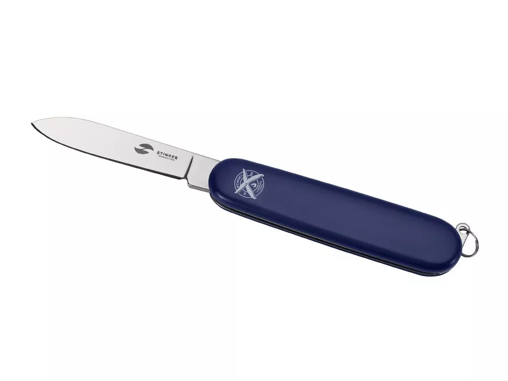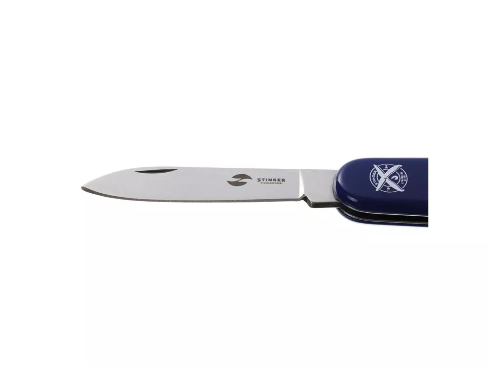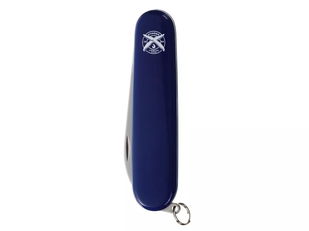 Нож перочинный STINGER имеет 2 функции: 1. Лезвие 2. Кольцо для ключей ХАРАКТЕРИСТИКИ Материалы • лезвие/инструменты: нержавеющая сталь 420, твердость 44-48 HRC • рукоять: нержавеющая сталь 420, твердость 44-48 HRC • накладки рукояти: АБС-пластик Размеры • Размеры ножа: 90х26,5х14 мм • Общая длина: 160,1 мм • Длина клинка: 67,5 мм • Наибольшая ширина клинка: 12,3 мм • Толщина обуха: 2,5 мм • Длина рукояти: 92,6 мм • Ширина рукояти (в ср.части): 20,3 мм • Толщина рукояти (в ср.части): 12,1 мм Вес: 50 г Цвет накладок рукояти: синий Накладки рукояти ножа не подлежат замене. Упаковка: картонная коробка