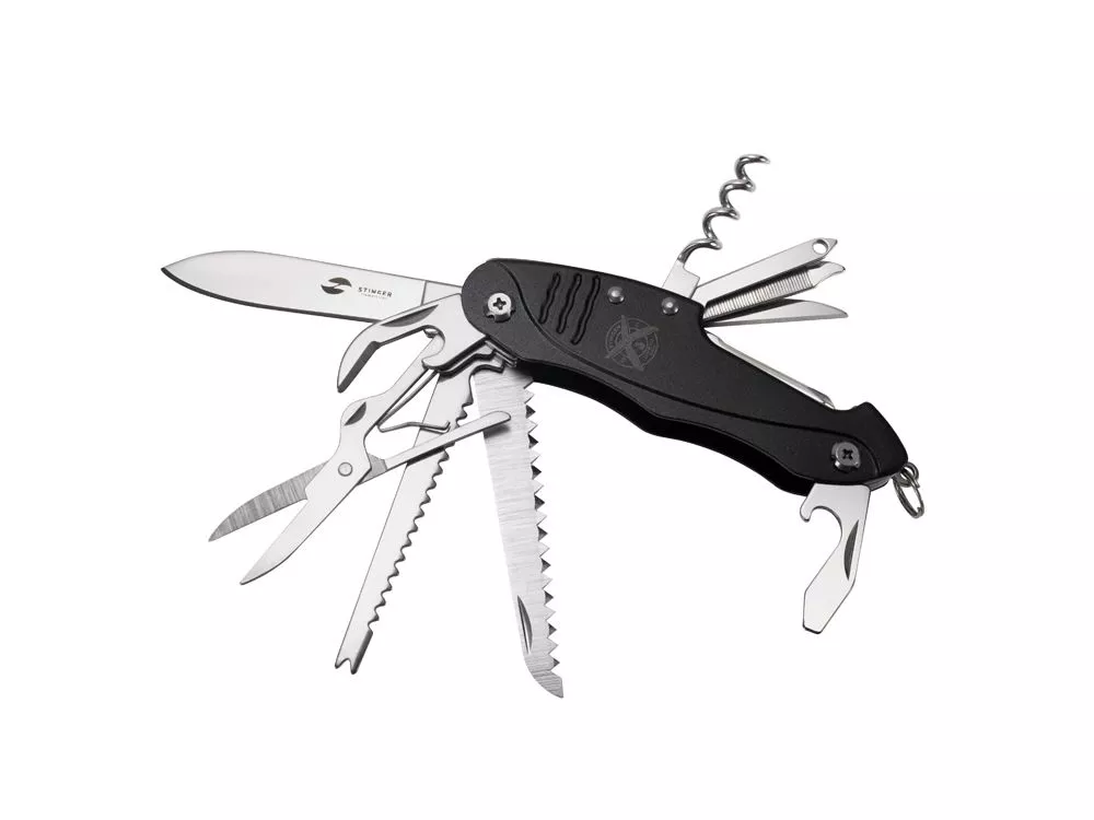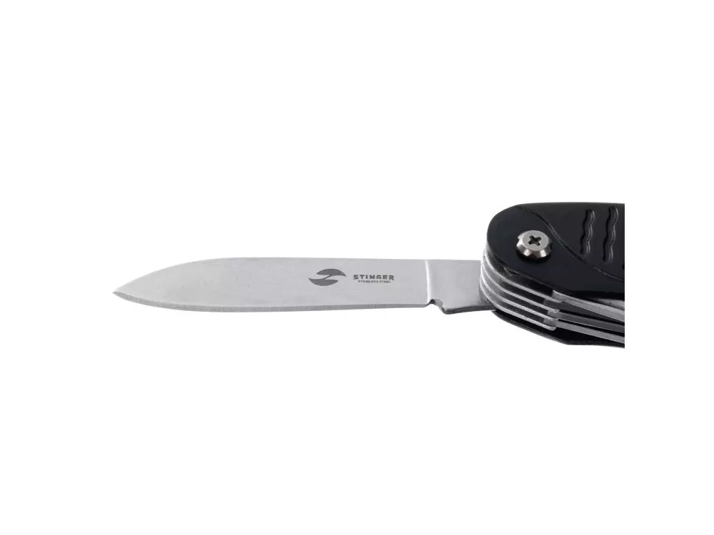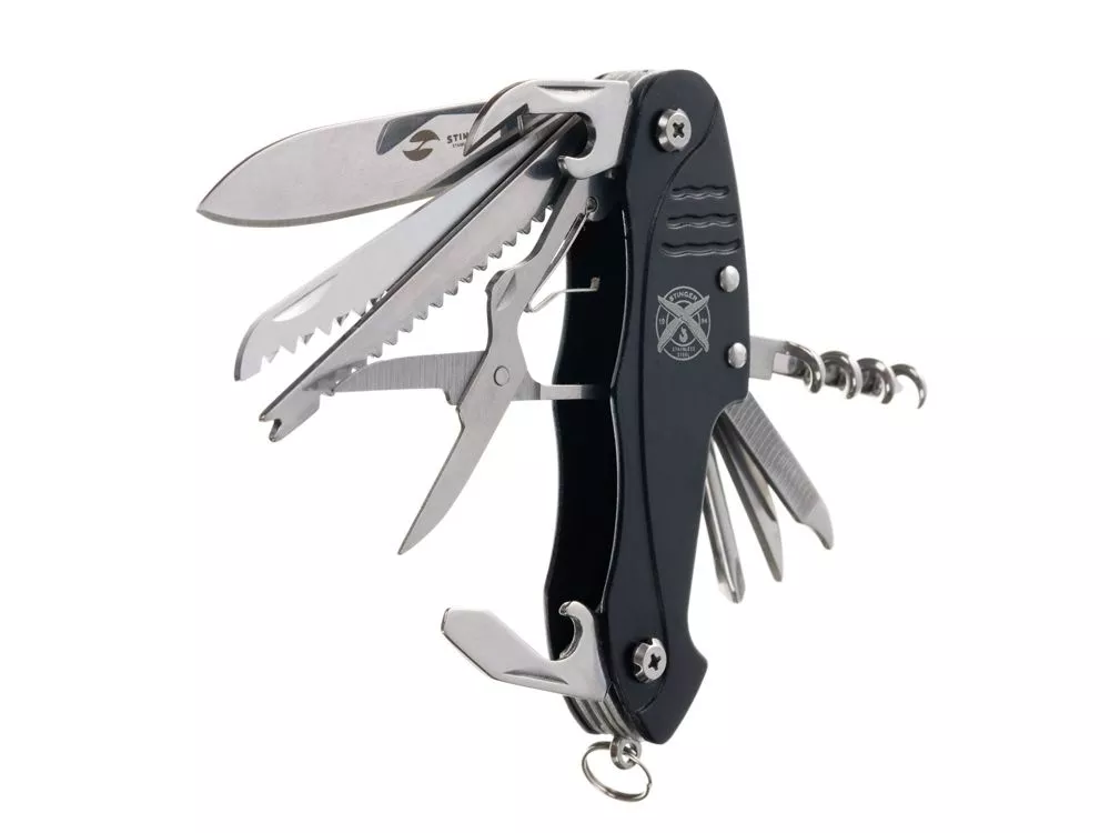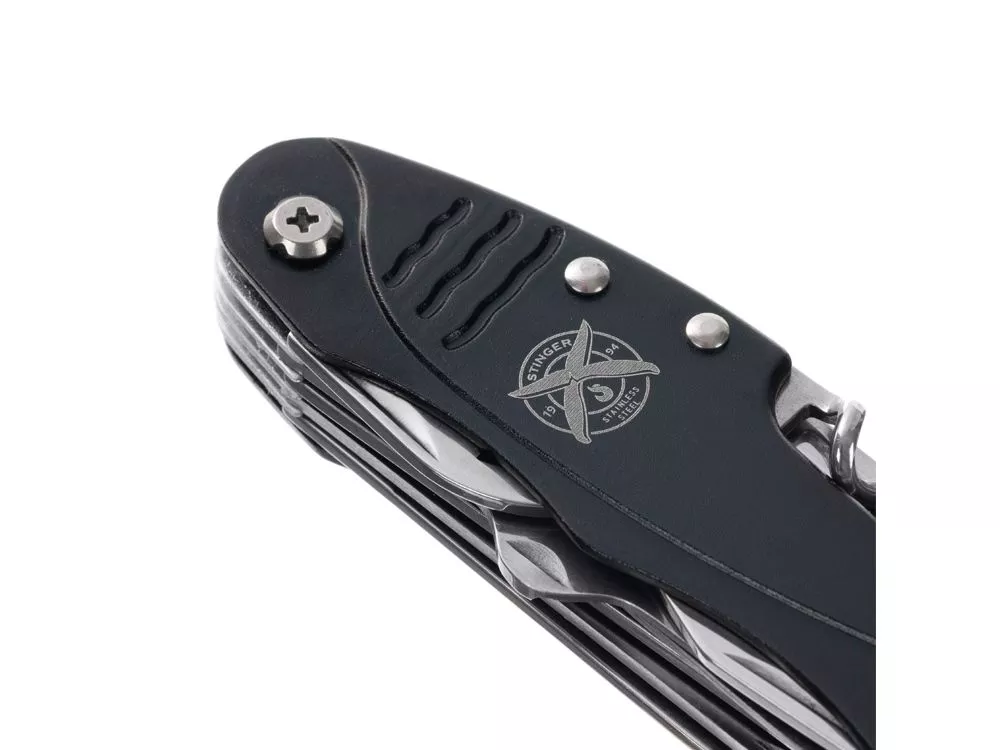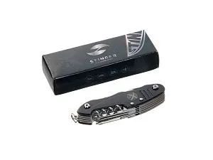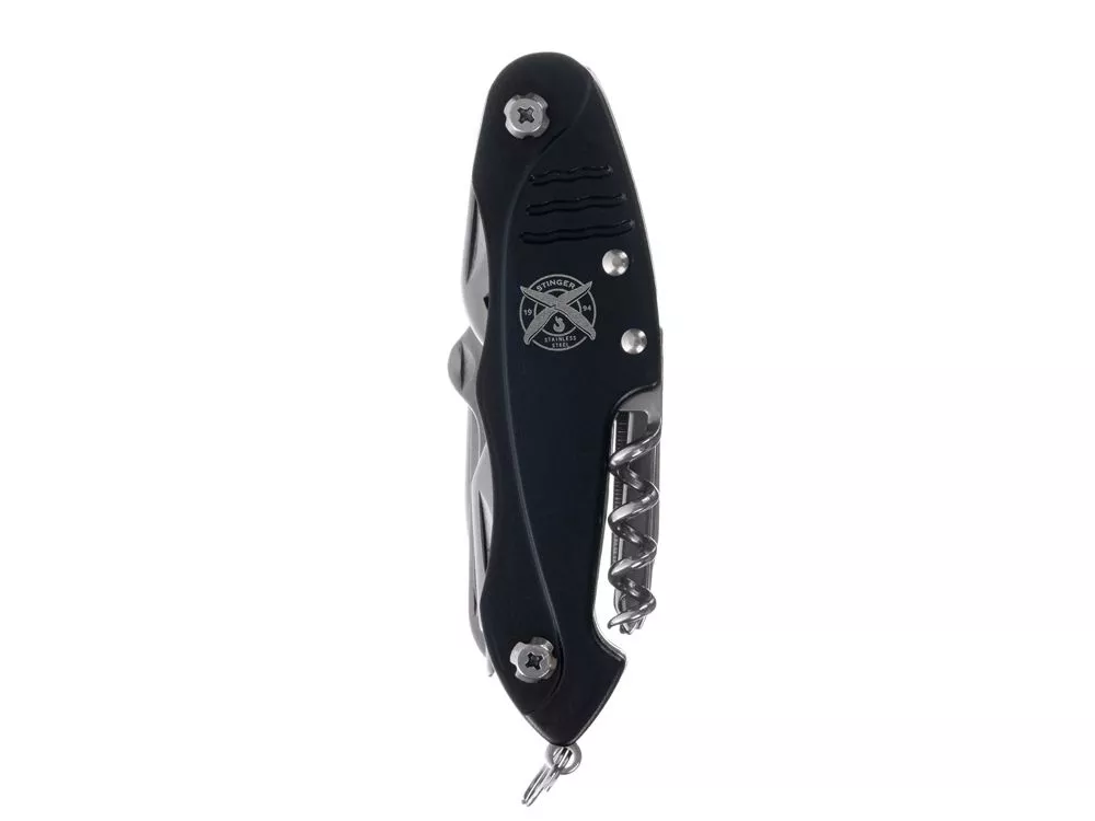 Нож перочинный STINGER имеет 15 функций: 1. Большое лезвие 2. Пила по дереву 3. Инструмент для чистки рыбы с: 4. - Инструментом для извлечения рыболовного крючка 5. Ножницы 6. Консервный нож 7. Открывалка для бутылок с: 8. - Отверткой 9. Крестовая отвертка 10. Ледокол 11. Пилка для ногтей с: 12. - Инструментом по уходу за ногтями 13. Игла 14. Штопор 15. Кольцо для ключей Материалы • лезвие/инструменты: нержавеющая сталь 420, твердость 44-48 HRC • рукоять: нержавеющая сталь 420, твердость 44-48 HRC • накладки рукояти: алюминий Размеры • Размеры ножа: 96х28х19 мм • Общая длина: 158,8 мм • Длина клинка: 62,7 мм • Наибольшая ширина клинка: 12 мм • Толщина обуха: 1,7 мм • Длина рукояти: 96,1 мм • Ширина рукояти (в ср.части): 24,4 мм • Толщина рукояти (в ср.части): 15,4 мм Вес: 108 г Цвет накладок рукояти: черный Накладки рукояти ножа не подлежат замене. Упаковка: картонная коробка