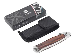 НОЖ СКЛАДНОЙ STINGER Материал лезвия: нержавеющая сталь марки 3Cr13 Материал рукояти: сталь + красное сандаловое дерево Фиксатор лезвия: Liner Lock Длина ножа: 245 мм Длина клинка: 106 мм Толщина клинка: 3,5 мм Вес: 216 г Цвет рукояти: древесный Особенности: с отверстием под темляк Метод открывания клинка: шпенёк (подпальцевый упор на лезвии) В комплекте: нейлоновый чехол