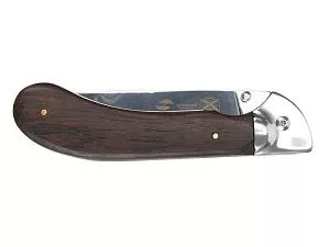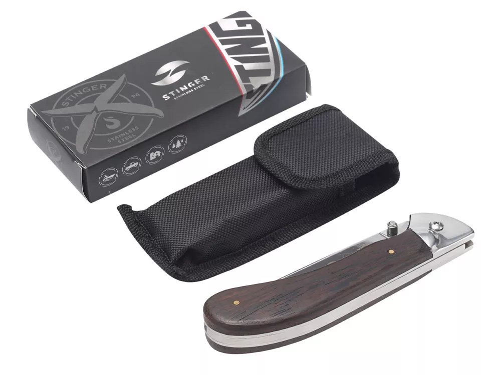 НОЖ СКЛАДНОЙ STINGER Материал лезвия: нержавеющая сталь марки 3Cr13 Материал рукояти: сталь + дерево Венге Фиксатор лезвия: Liner Lock Длина ножа: 242 мм Длина клинка: 105 мм Толщина клинка: 3,5 мм Вес: 216 г Цвет рукояти: древесный Метод открывания клинка: шпенёк (подпальцевый упор на лезвии) В комплекте: нейлоновый чехол