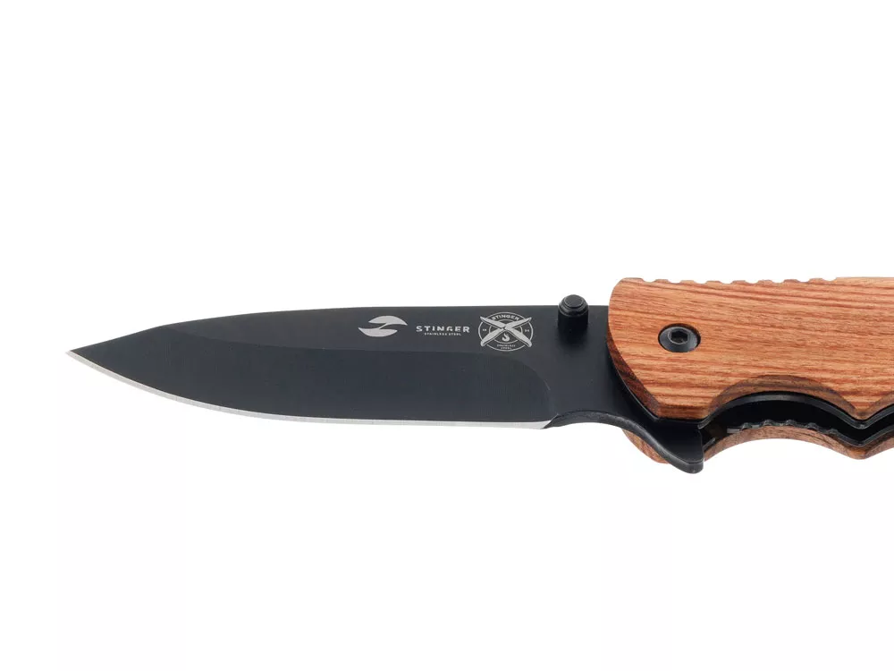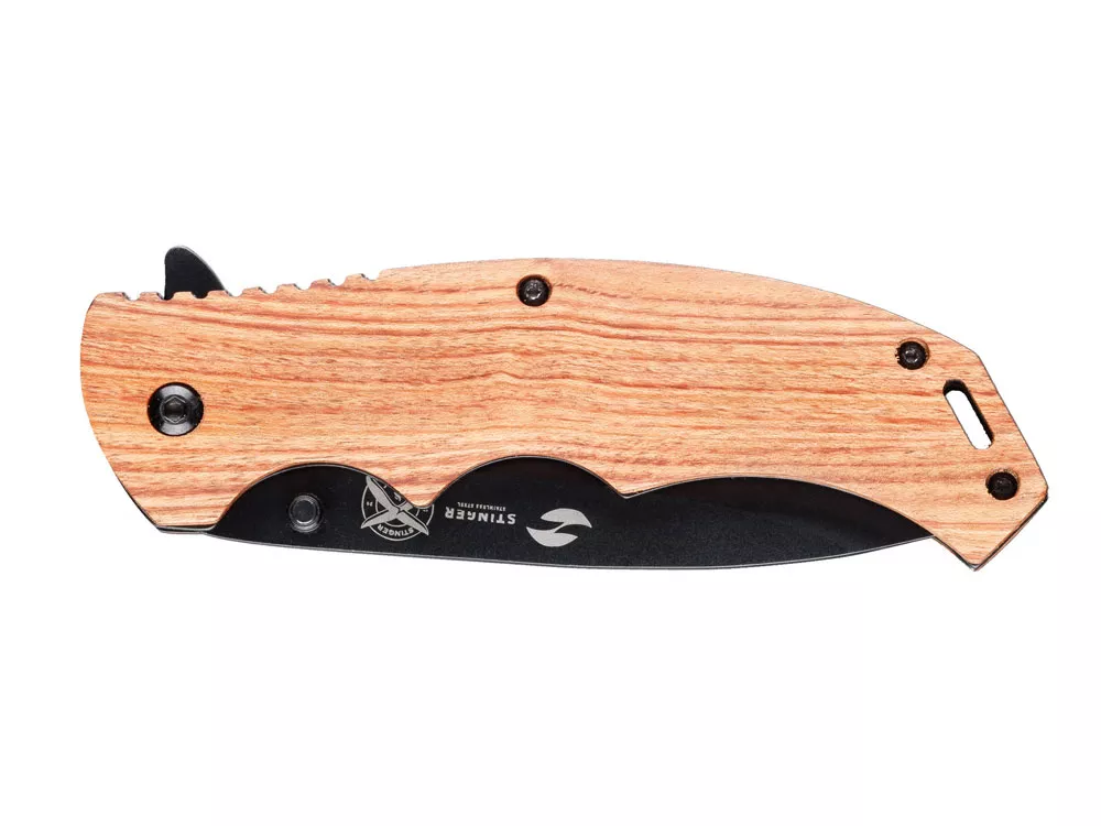 НОЖ СКЛАДНОЙ STINGER Материал лезвия: нержавеющая сталь Материал рукояти: сталь + дерево Фиксатор лезвия: Liner Lock Длина ножа: 210 мм Длина клинка: 90 мм Толщина клинка: 3 мм Вес: 119 г Цвет рукояти: коричневый Особенности: рукоять с отверстием под темляк Метод открывания клинка: шпенёк (подпальцевый упор на лезвии) В комплекте: нейлоновый чехол