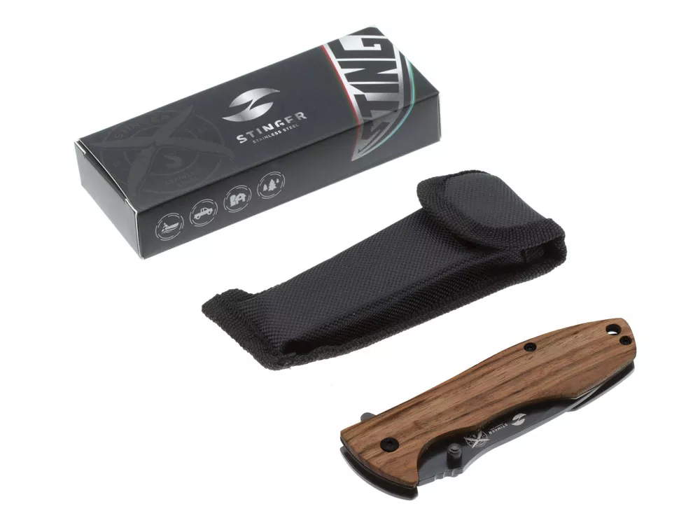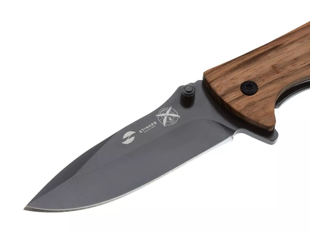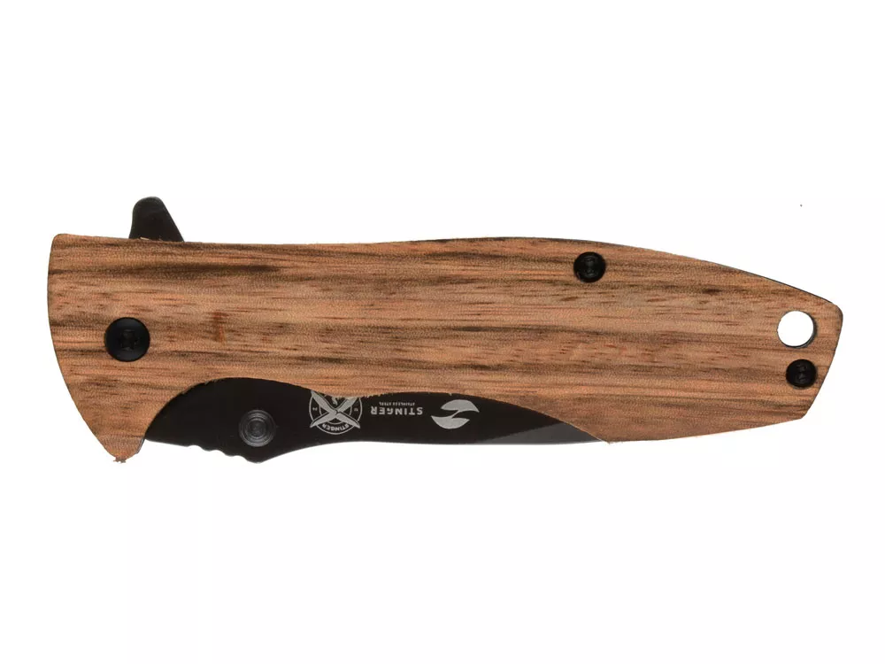 НОЖ СКЛАДНОЙ STINGER Материал лезвия: нержавеющая сталь марки 3Cr13 Материал рукояти: сталь + дерево пакка Фиксатор лезвия: Liner Lock Длина ножа: 218 мм Длина клинка: 91 мм Толщина клинка: 3,5 мм Вес: 207 г Цвет рукояти: древесный Особенности: с отверстием под темляк Метод открывания клинка: шпенёк (подпальцевый упор на лезвии) В комплекте: нейлоновый чехол