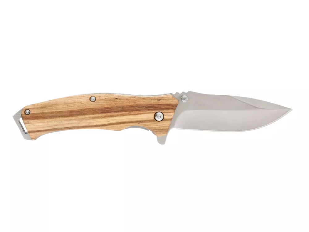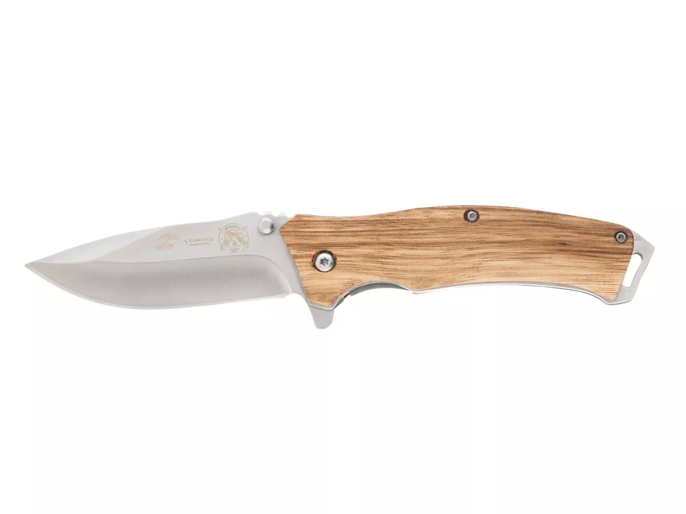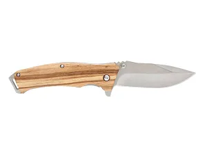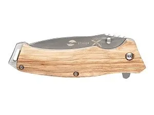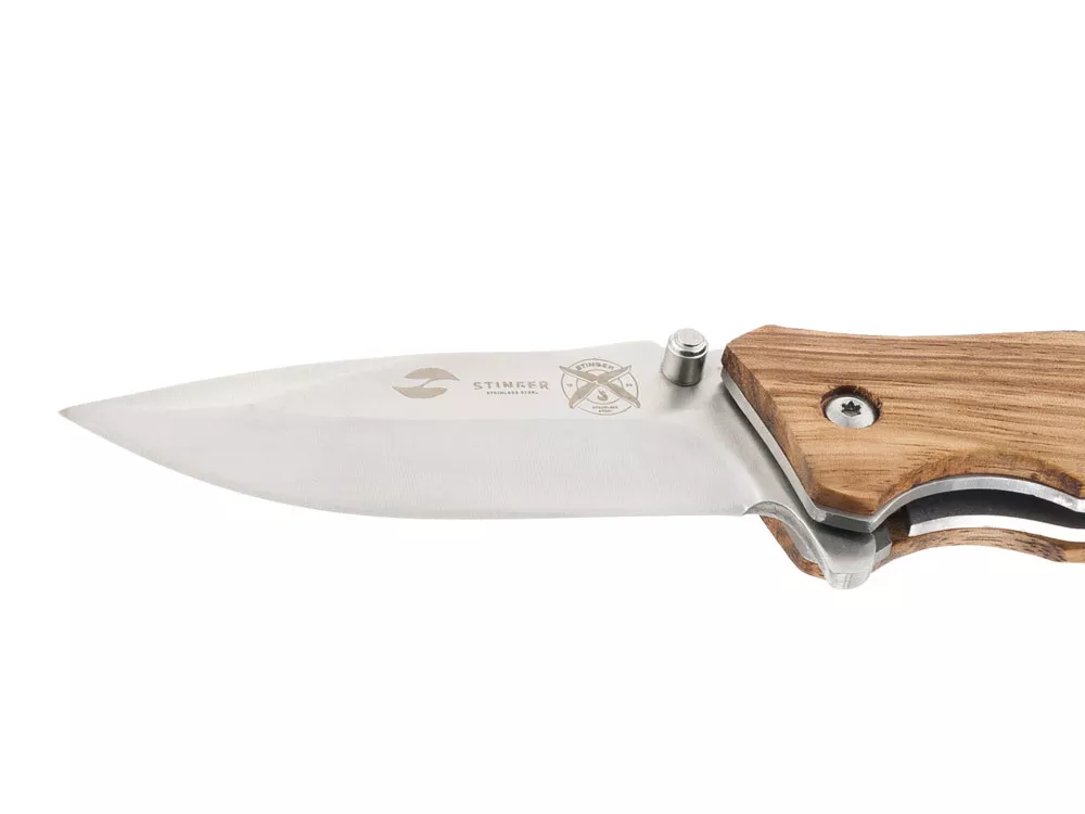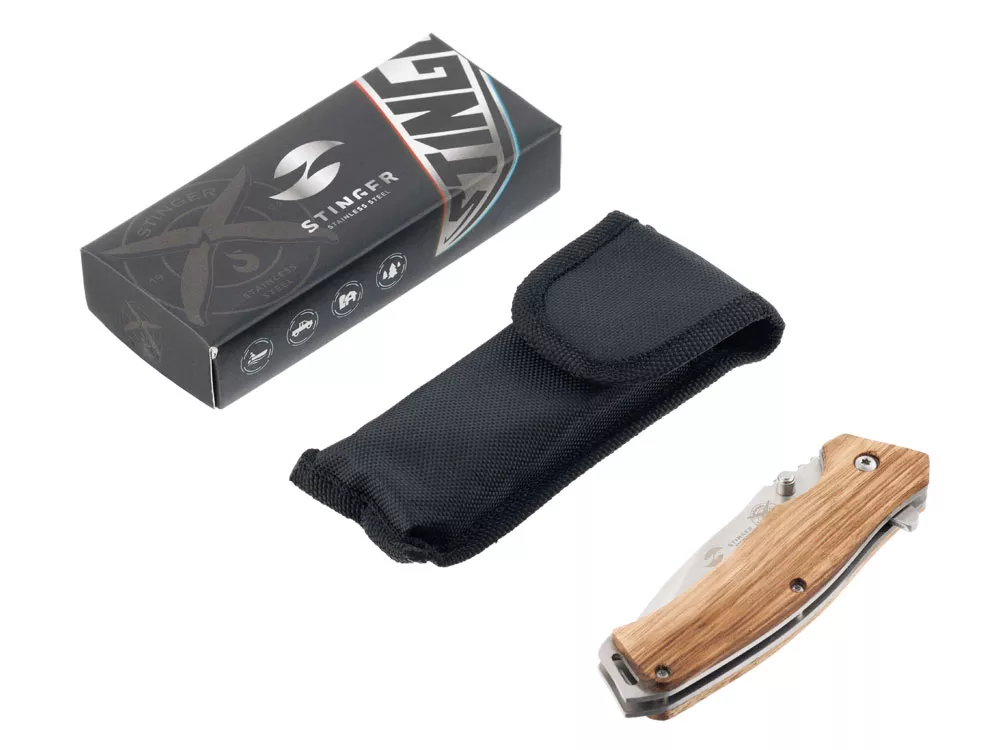 НОЖ СКЛАДНОЙ STINGER Материал лезвия: нержавеющая сталь Материал рукояти: сталь + дерево Фиксатор лезвия: Liner Lock Длина ножа: 190 мм Длина клинка: 80 мм Толщина клинка: 3 мм Вес: 121 г Цвет рукояти: светло-коричневый Особенности: рукоять с отверстием под темляк Метод открывания клинка: шпенёк (подпальцевый упор на лезвии) В комплекте: нейлоновый чехол
