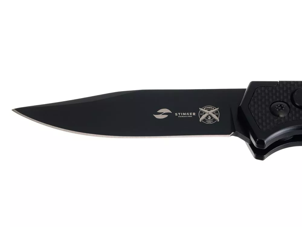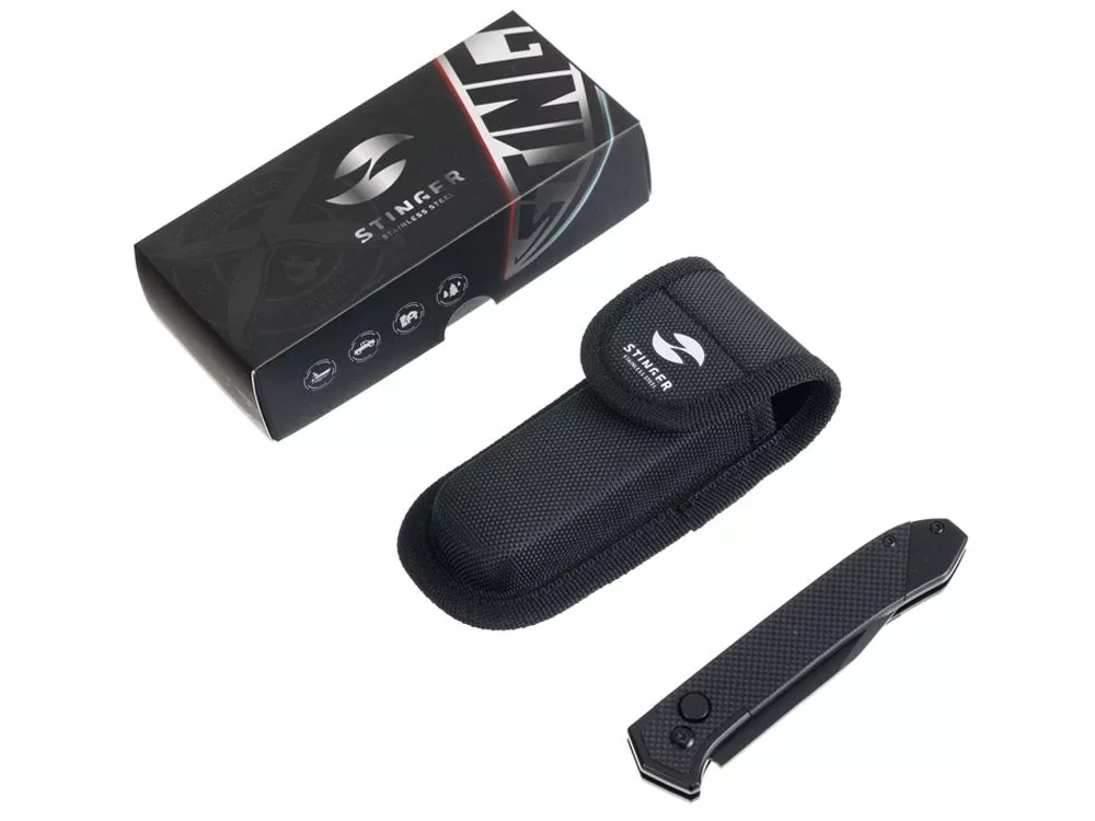НОЖ СКЛАДНОЙ STINGER Автоматический складной нож из высококачественных материалов, идеально подойдет для повседневного использования. Рукоять ножа изготовлена из нержавеющей стали с накладками из стеклотекстолита G10 - композитного материала на основе стеклоткани и эпоксидной смолы. G10 является прочным и ударостойким материалом, отлично переносит влагу, отличается повышенной стойкостью к огню. Рукоять ножа собрана на втулках - бонках, поэтому при необходимости его можно легко промыть. На рукояти расположена съемная клипса для удобного размещения ножа в кармане. Нож легко открывается и надежно фиксируется благодаря замку Button Lock. Клинок изготовлен из нержавеющей стали 8CR14MoV. Основное преимущество этой стали - отличное противодействие коррозии благодаря высокому содержанию хрома (14,5%). Сталь 8CR14MoV относится к высокоуглеродистым сталям (0,8%), углерод в составе придает сплаву твердость в диапазоне 57-59 HRC, что позволяет режущей кромке лезвия длительное время оставаться острой. Оптимальное содержание легирующих элементов придает стали гибкость, лезвие хорошо поддается правке и заточке. Клинок из стали 8CR14MoV отличается высокой прочностью и устойчивостью к износу, имеет долгий срок службы, обеспечивает качественный и точный срез. Характеристики: Материал клинка: нержавеющая сталь 8CR14MoV Твердость по шкале Роквелла: 57-59 HRC Материал рукояти: нержавеющая сталь/стеклотекстолит G10 Метод открывания клинка: автомат Фиксатор клинка: Button Lock Длина ножа: 195 мм Длина клинка: 80 мм Толщина клинка: 3,5 мм Вес: 130 г Цвет рукояти: черный Особенности: рукоять с клипом В комплекте: нейлоновый чехол