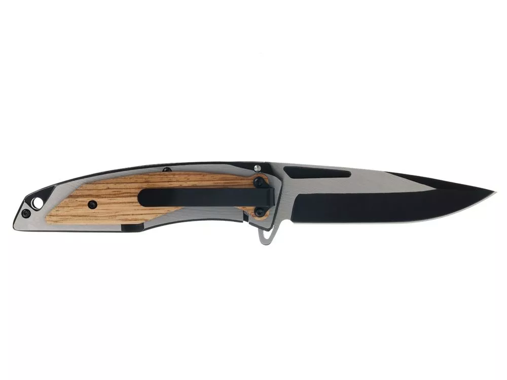 НОЖ СКЛАДНОЙ STINGER Повседневный нож для широкого спектра задач. Легкий и неприхотливый в обслуживании. Рукоять ножа произведена из нержавеющей стали с накладками из древесины, собрана на втулках - бонках, поэтому при необходимости нож можно легко промыть. Нож быстро открывается при помощи флиппера с ассистом (механизм ускоренного открывания). На рукояти расположено отверстие для темляка и клипса для удобного размещения ножа в кармане. Клинок ножа произведен из жаропрочной мартенситной стали 3Cr13. Преимуществом этой стали является отличное противодействие коррозии благодаря высокому содержанию хрома (13%). Оптимальное содержание легирующих элементов в составе сплава 3Cr13 придает ему хорошую твердость в диапазоне 52-55 HRC. Из-за низкого содержания углерода (0,3%) заточку лезвие из такой сталь держит средне, но легко затачивается даже после активной эксплуатации ножа. При этом дополнительных аксессуаров для заточки не требуется, достаточно простого точильного камня или мусата. Характеристики: Материал клинка: нержавеющая сталь 3CR13 Твердость по шкале Роквелла: 52-55 HRC Материал рукояти: нержавеющая сталь/древесина зебрано Метод открывания клинка: флиппер с ассистом (механизм ускоренного открывания) Фиксатор клинка: Liner Lock Длина ножа: 215 мм Длина клинка: 95 мм Толщина клинка: 3 мм Вес: 146 г. Цвет рукояти: коричневый/серебристый Особенности: рукоять с клипом и отверстием под темляк В комплекте: нейлоновый чехол