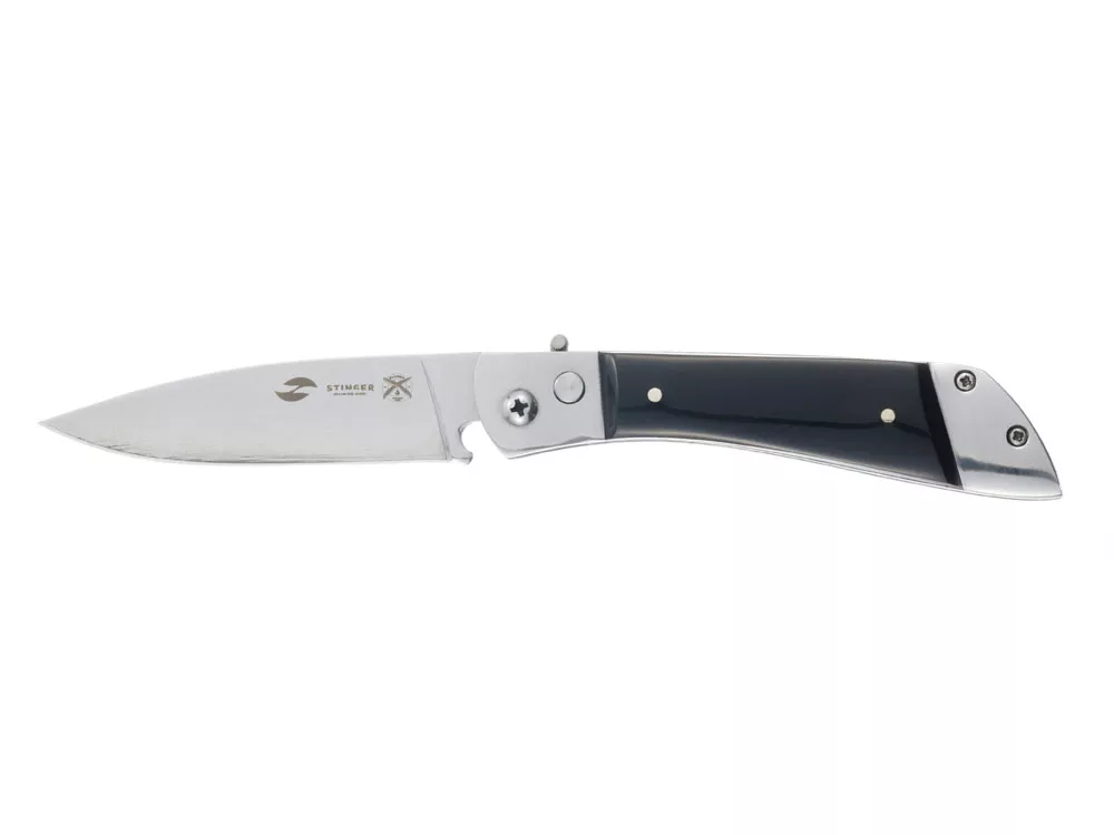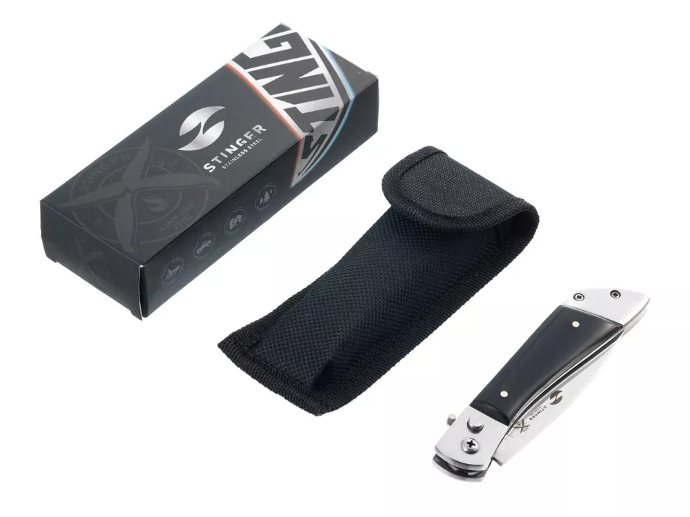 НОЖ СКЛАДНОЙ STINGER Материал лезвия: нержавеющая сталь марки 420 Материал рукояти: нержавеющая сталь, древесина венге Фиксатор лезвия: Rolling Lock Длина ножа: 207 мм Длина клинка: 90 мм Толщина клинка: 2 мм Вес: 115 г Цвет рукояти: чёрно-серебристый Метод открывания клинка: автомат В комплекте: нейлоновый чехол