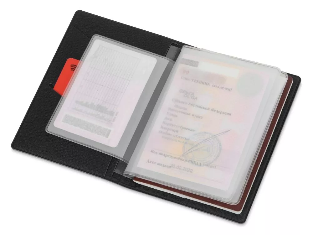 Обложка (портмоне) для документов - это необходимая вещь для любого автовладельца. Качественная обложка сохранит документы в целости, защищая их от изломов, пыли и грязи. Данная обложка из искусственной кожи станет стильным и функциональным аксессуаром. Внутренние вкладыши выполнены из пленки пвх и позволяют разместить: паспорт, свидетельство о регистрации тс, полис осаго, водительское удостоверение, также имеется кармашек для пластиковой карты. Тиснение (Блинт) на данный товар осуществляется бесплатно. Оплачивается только настройка оборудования в размере 5800 рублей на весь тираж.