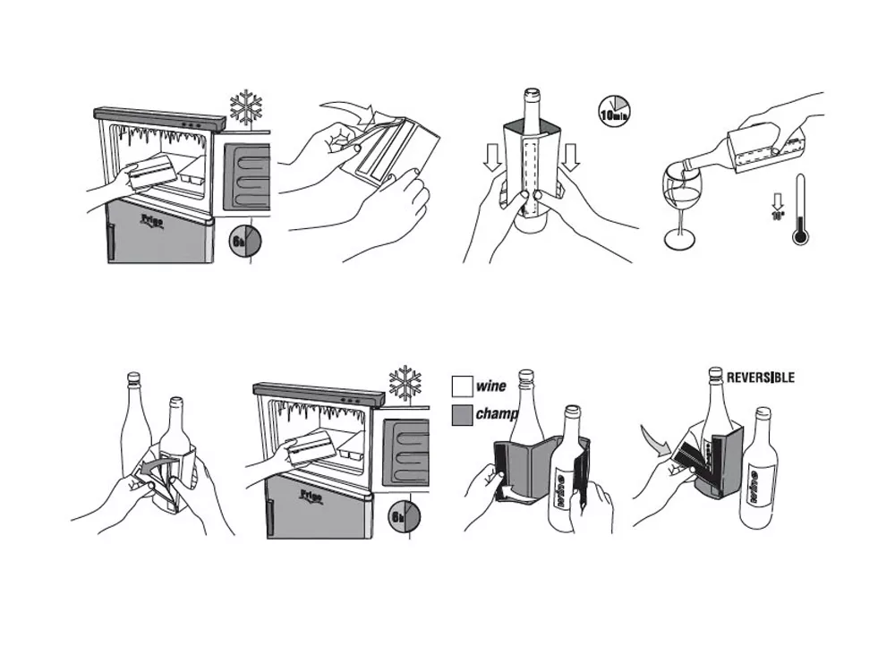 Охладитель-чехол сохранит идеальную температуру бутылки вина или шампанского в течение всего приема пищи. Храните охладитель в морозильной камере, чтобы он был готов к использованию в случае необходимости. Плотно закрепляется на бутылке с помощью липкой ленты.