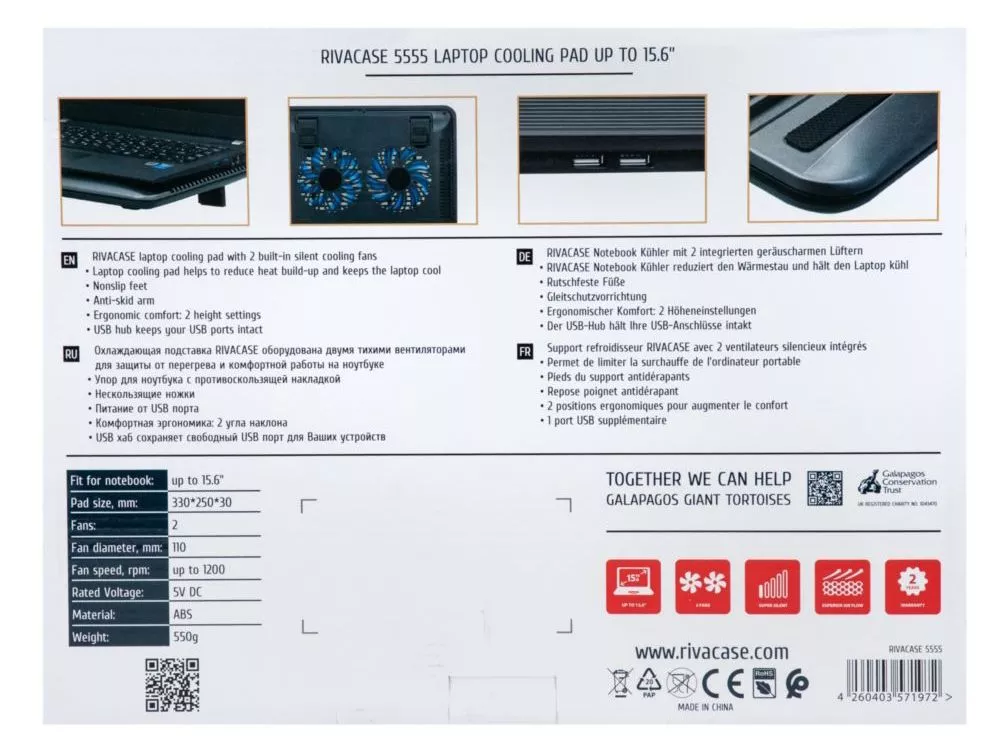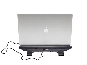 Охлаждающая подставка с 2 встроенными тихими вентиляторами создана для комфортной работы на ноутбуке и защиты от перегрева. • Подставка RIVACASE охлаждает ноутбук, что помогает уменьшить количество сбоев. • Питание от USB порта. • Комфортная эргономика: 2 угла наклона. • Упор для ноутбука с противоскользящей накладкой. • Нескользящие ножки. • 2 малошумящих вентилятора. • Скорость вращения вентиляторов : до 1200 об/мин. • Диаметр вентиляторов : 110 мм.