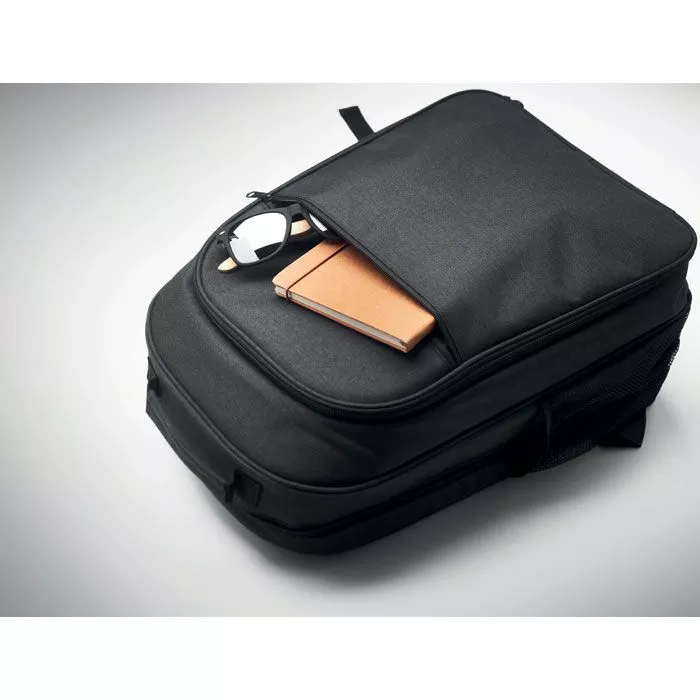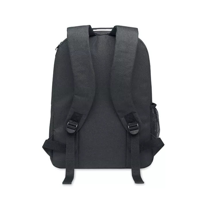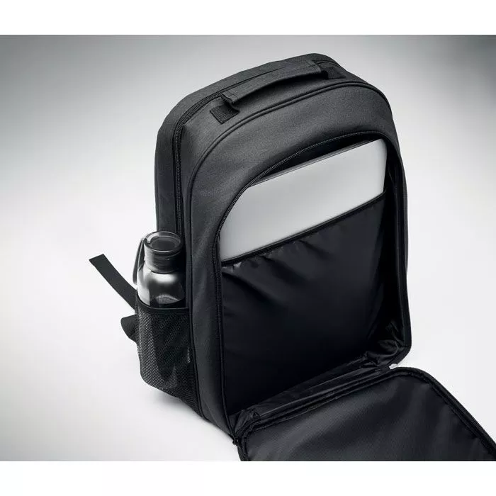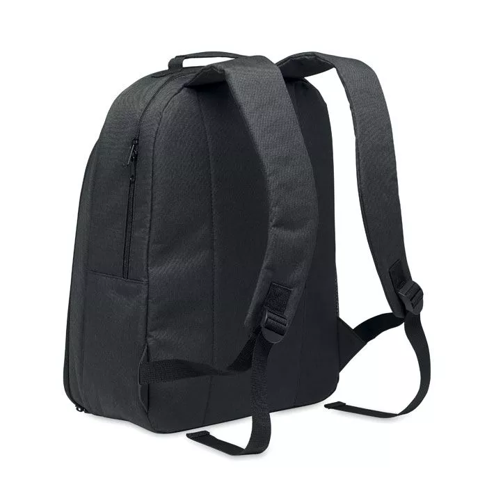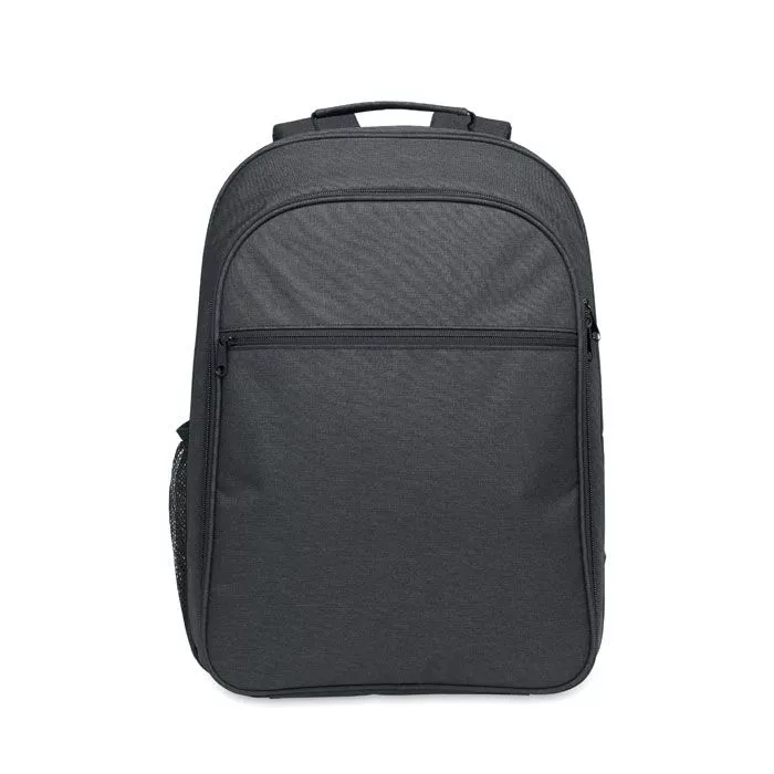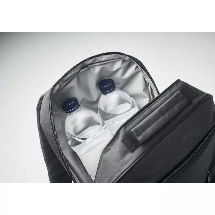 Охлаждающий рюкзак из материала 300D RPET с отделением для 15-дюймового ноутбука. Передний карман на молнии и одно боковое сетчатое отделение.