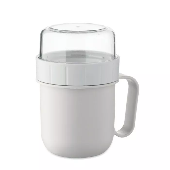 Breakfast or brunch on the go cup in PP and PS lid container. Consists of 2 individual containers to keep ingredients separate. Capacity: 450 ml and 160 ml. Leak-free.