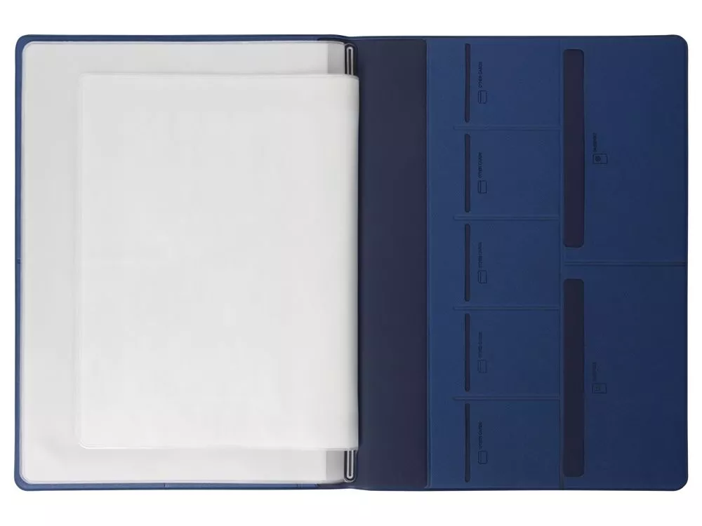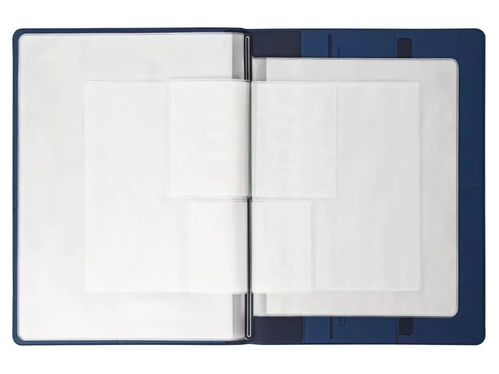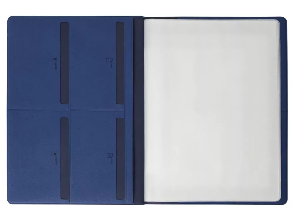 Органайзер формата А4 позволяет хранить документы в расправленном виде, защищая их от механических повреждений. С ним свидетельства о рождении, браке, важные документы, чеки и другие бумаги будут рассортированы и доступны для просмотра, будучи помещенными в прозрачные кармашки из пленки ПВХ пяти форматов: 168 х 216 мм, 65 х 95 мм, 90 х 120 мм, 228 х 304 мм, 205 х 255 мм. Прозрачные карманы выполнены из прочной фактурной пленки, стойкой к истиранию, общее количество — 20, по 4 кармана каждого из пяти типов. Обложка выполнена из экокожи, имеет внутренний слой из бархатистого материала и разбита на множество карманов: два больших кармана-отделения А4, 6 горизонтальных кармана с подписями и иконками, уточняющими тип документа, который можно поместить внутрь, пять карманов под визитки или кредитные карты. Тиснение (Блинт) на данный товар осуществляется бесплатно. Оплачивается только настройка оборудования в размере 5800 рублей на весь тираж.