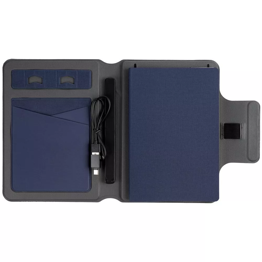 Органайзер с блокнотом и аккумулятором с беспроводной зарядкой. Обложка с фактурой, имитирующей ткань, на магнитной застежке.