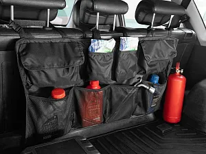 В органайзере имеются разные по форме и типу карманы: карманы-сетки, карманы с крышкой на липучке, открытые карманы.Конструкция крепится ремнями за подголовники задних сидений. Дополнительно на задней части органайзера имеются ленты-липучки, которые обеспечивают полное прилегание органайзера к спинкам задних кресел.