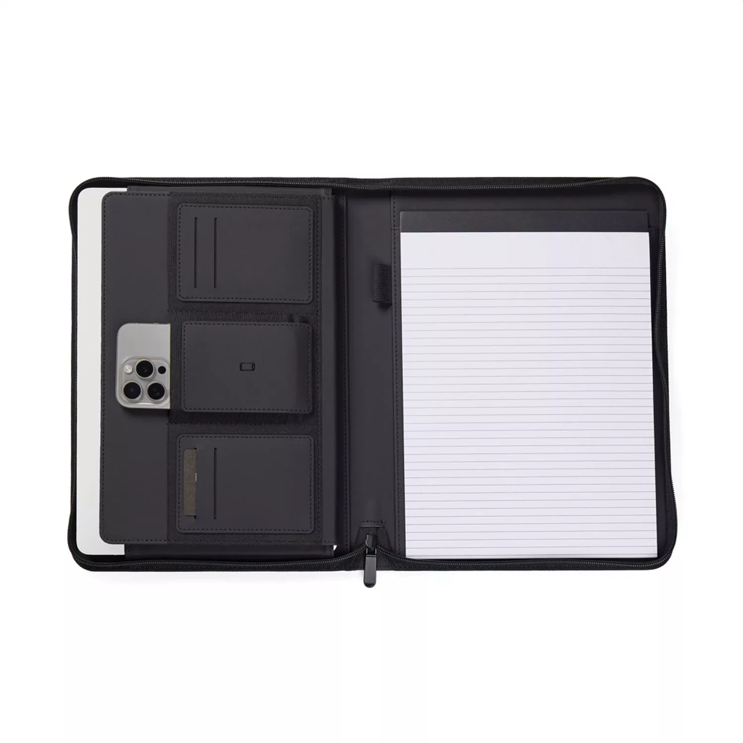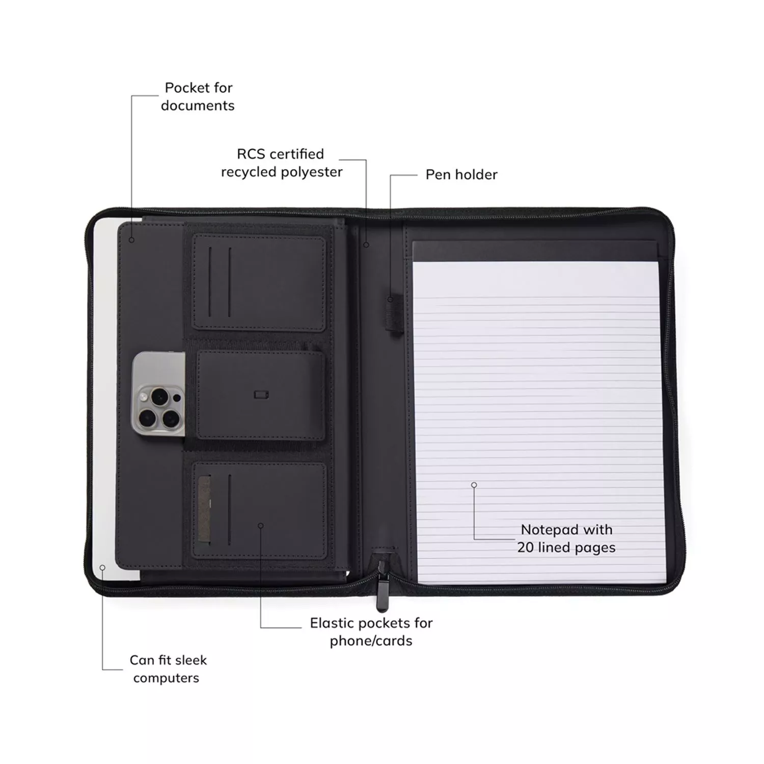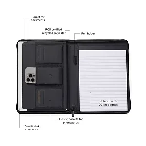 Возьмите с собой самое необходимое с помощью стильного и вместительного органайзера VINGA Baltimore. В нем все предусмотрено: держатель для ручки, отделение для документов, карманы для карточек и смартфона, блокнот из 20 линованных листов для заметок. Кстати, блокнот легко вынуть и заменить, поэтому срок службы органайзера не ограничен. Товар частично сделан из переработанных материалов, сертифицированных RCS. Сертификация RCS гарантирует, что вся цепочка поставок была проверена и подтверждена.