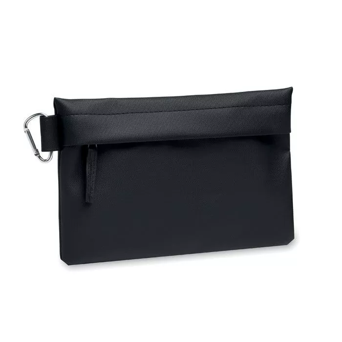 Portable organizer / pouch with PU coated 600D RPET polyester and zippered closure.