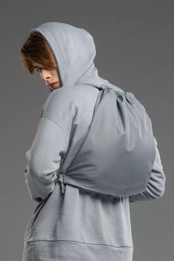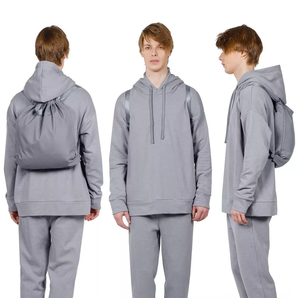 Прочный и вместительный трансформер — шопер и рюкзак на шнурках — разработан в рамках единой коллекции одежды и аксессуаров и легко комбинируется с ее элементами. Специально спроектированные лекала и технологии пошива открывают простор для любых вариантов кастомизации и нанесения изображений. На видимой части изделий нет лейблов с айдентикой бренда, а название бренда с уходника легко удалить.