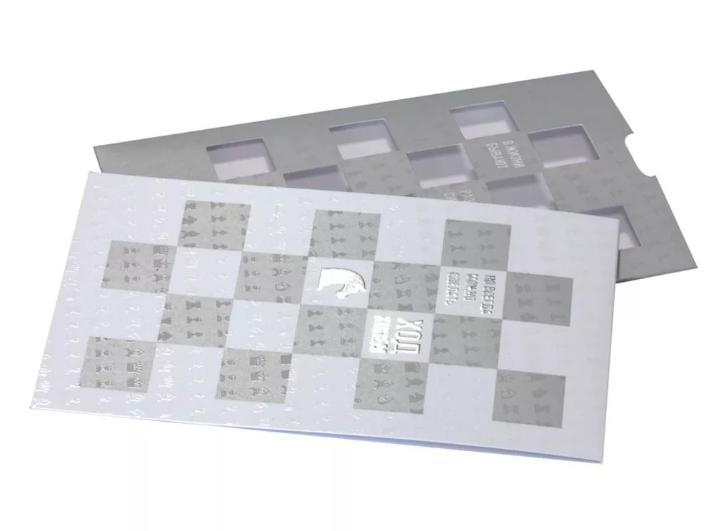 Открытка изготовлена из дизайнерского картона представительского класса с необычными элементами объемного тиснения и покрыта УФ-лаком, который создает шахматный узор. Возможно нанесение методом цифрового офсета.
