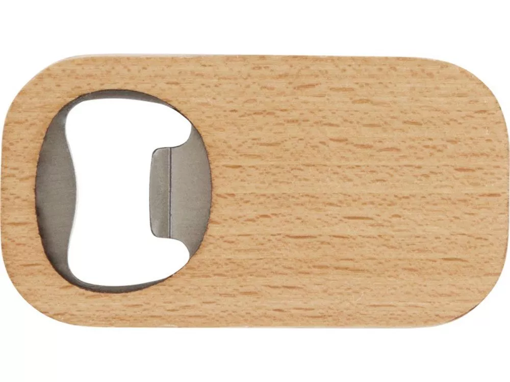 Открывалка для бутылок из нержавеющей стали с деревянной поверхностью. Дерево, нержавеющая сталь.